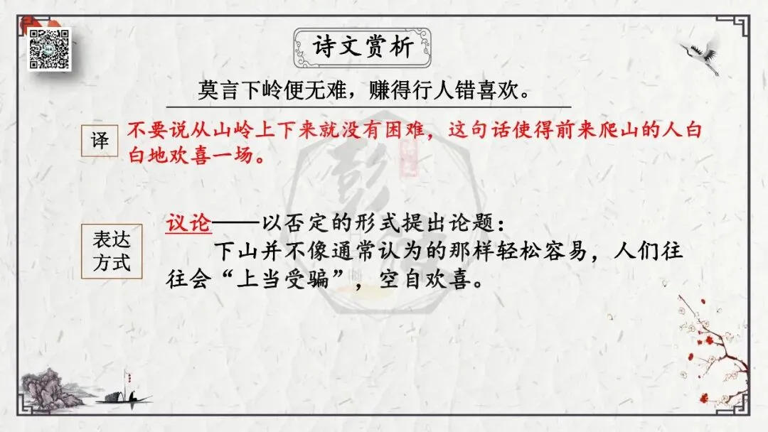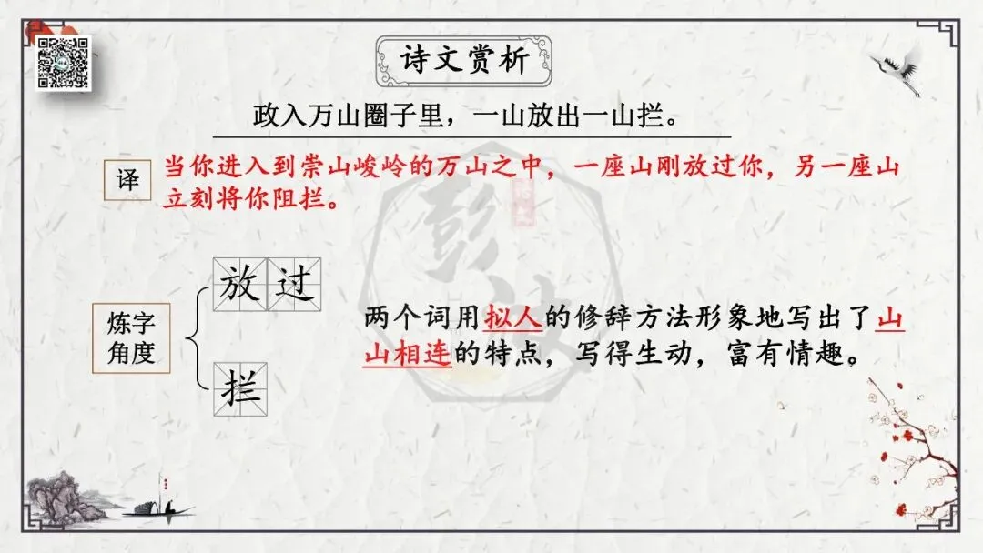 2、修饰语:大部分为形容词,它在诗词鉴赏中也是关注的重点对象。例:黄河远上白云间,一片孤城万仞山。 一个“孤”字,写尽环境之孤苦,由此可达人心。