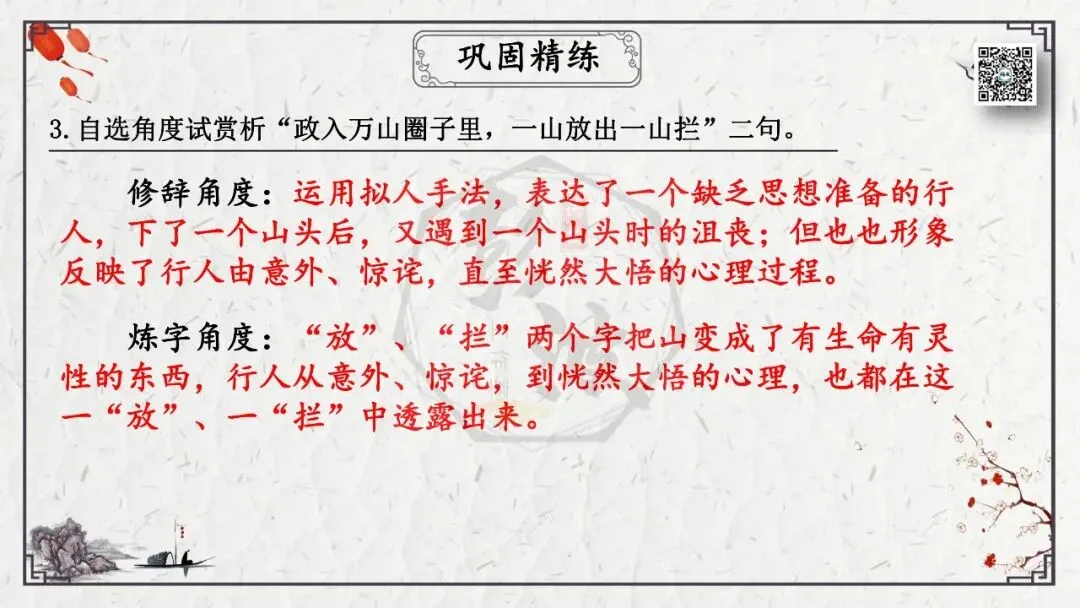 4、品味语言。主要包括词语的锤炼、句子的推敲、名句的领悟、修辞的效果和诗的节奏韵律等。