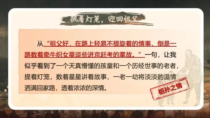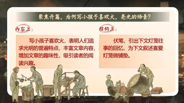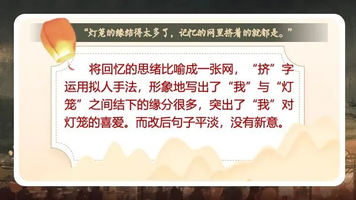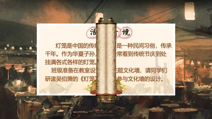 本篇课文以”灯笼”为题,回忆作者早年与灯笼相关的一些生活景象,流露出对故乡和亲人的怀念,并在结尾处结合当时的国运时事,表明要做抗日“马前卒”的心愿,传达出那个时代的“正能量”。学习这篇散文要注意分析文中多种表达方式的运用,认识文中“灯笼”的民俗意义、文化价值,品味、揣摩文中富有表现力的语言,体会作者对往昔生活和家国天下所寄予的复杂感情。