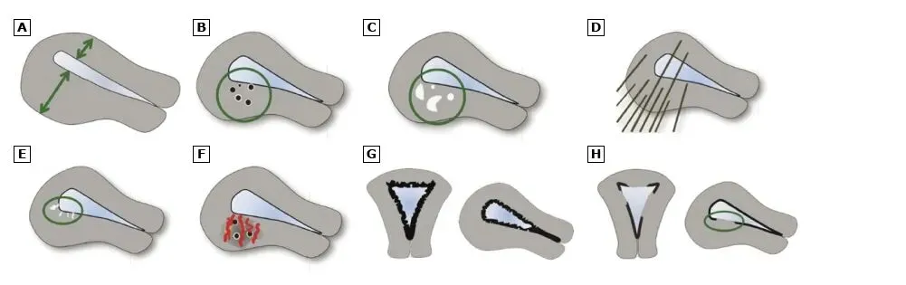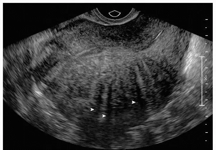 ●多囊卵巢:双侧卵巢均匀增大,形态规整;壁厚光滑,回声增强;显示卵巢内有10多个甚至数十个直径<10mm的囊泡,边界清晰;子宫较小;卵巢动脉血流阻力升高。