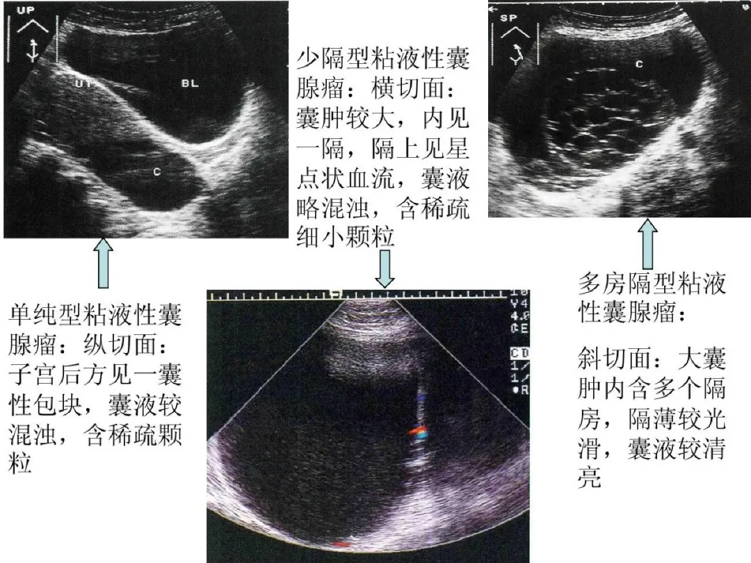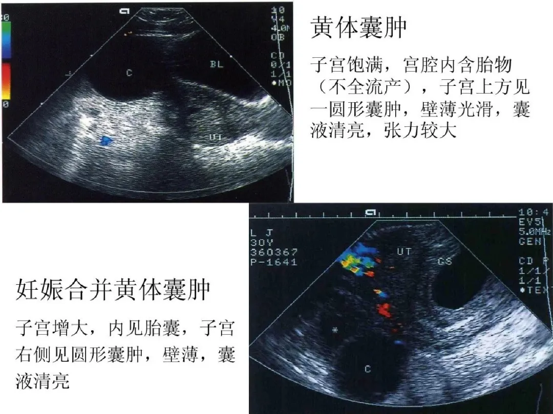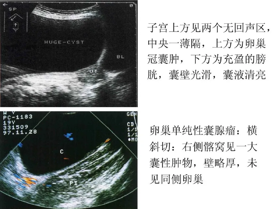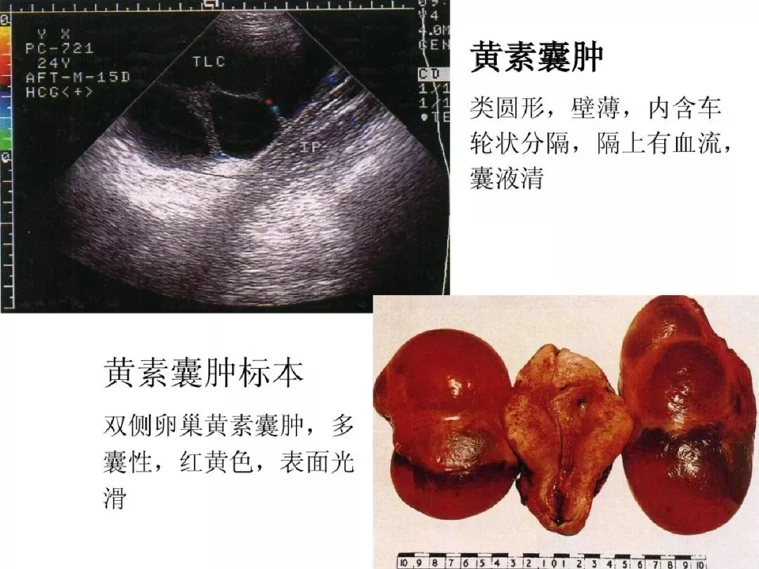 ●黄素囊肿:囊肿较大;呈不规则形、叶状;内部可有分隔,呈车轮状;壁薄而光滑;隔壁上可显示血流信号。