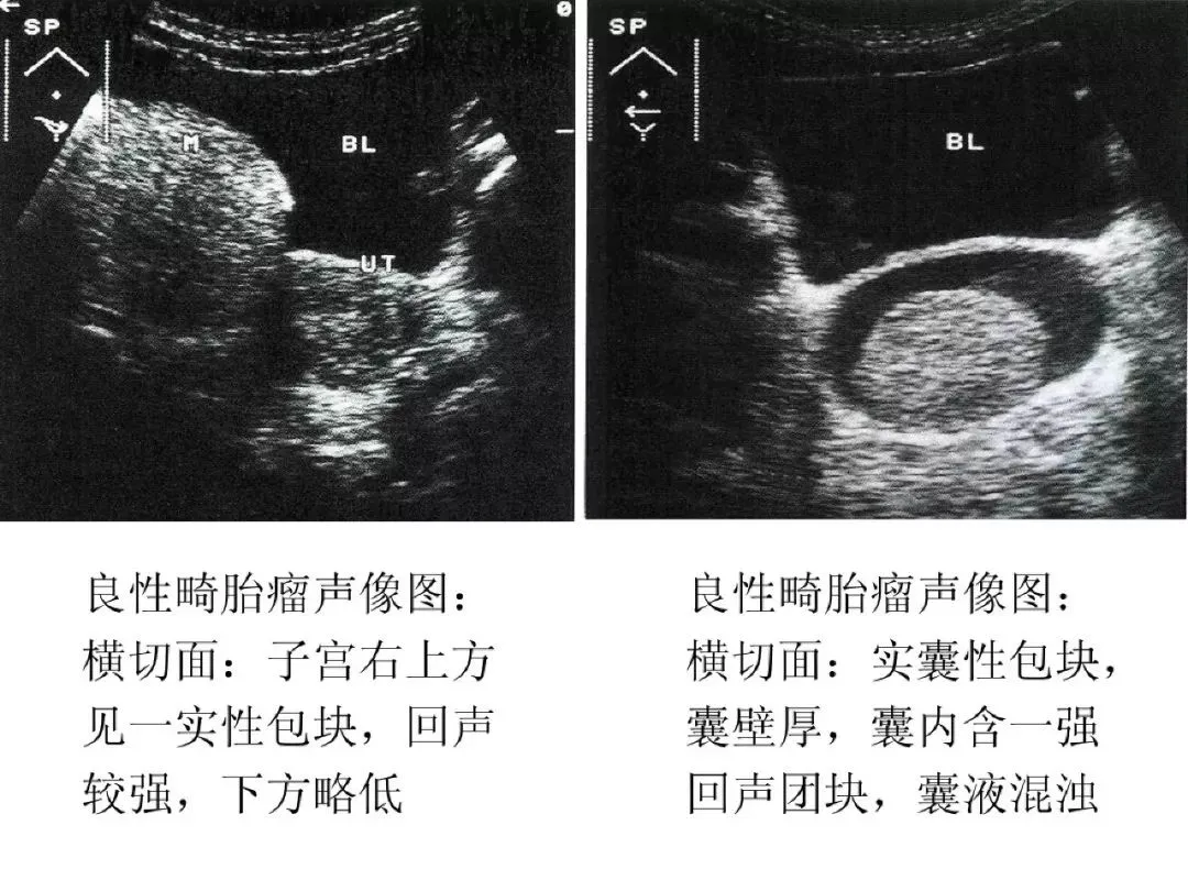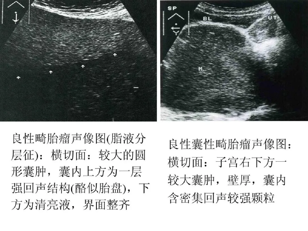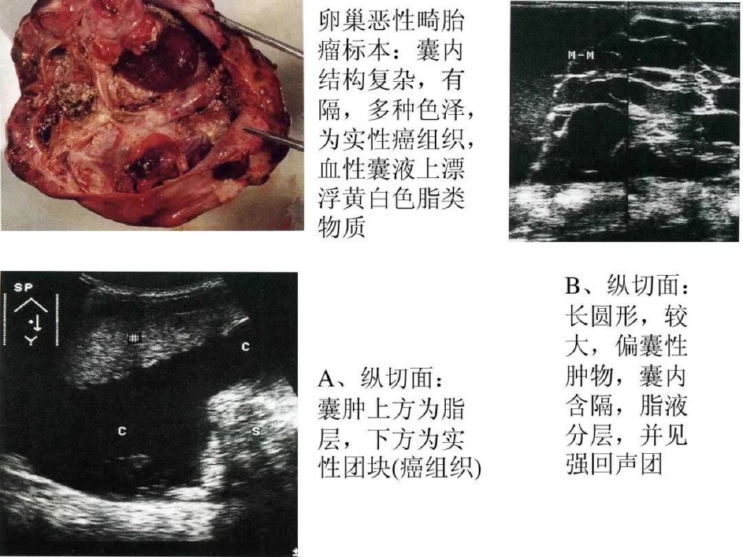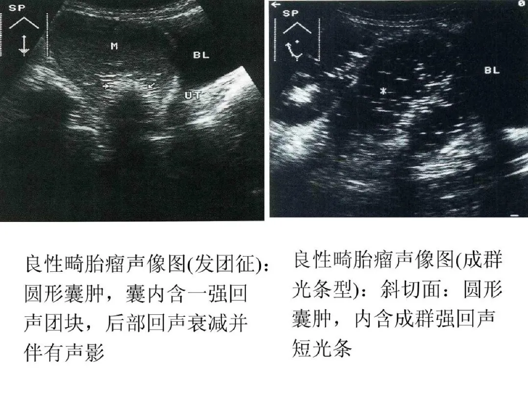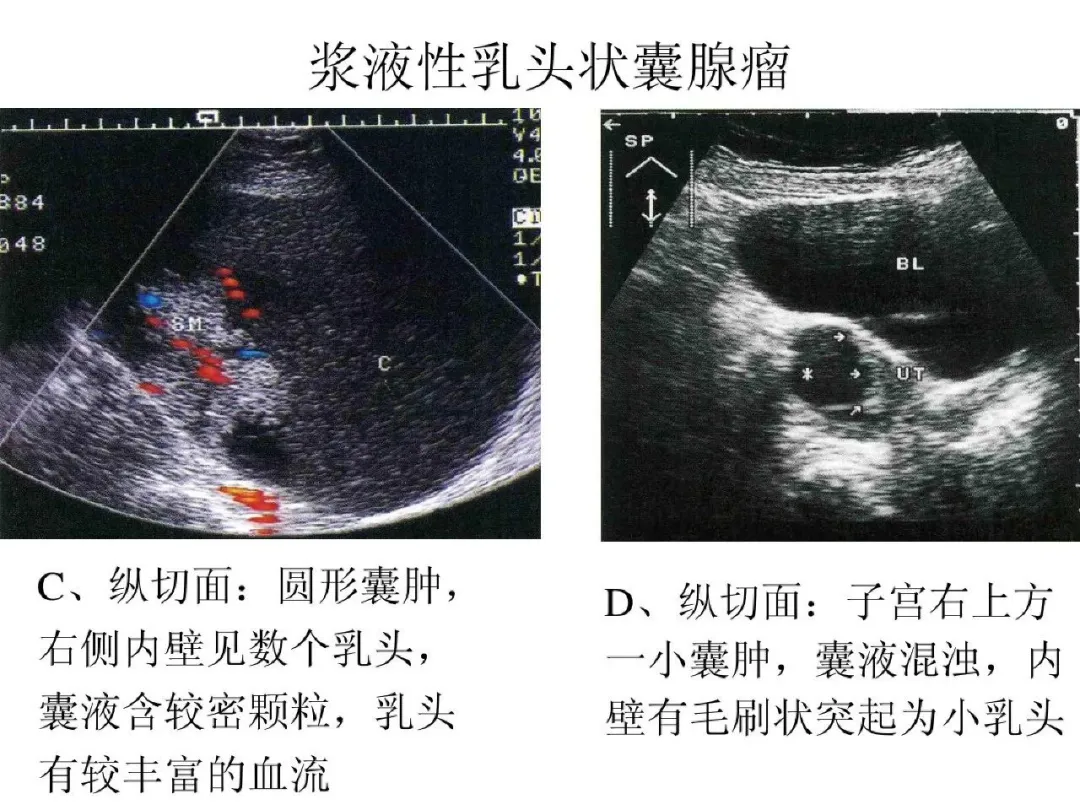 ●黄素囊肿:囊肿较大;呈不规则形、叶状;内部可有分隔,呈车轮状;壁薄而光滑;隔壁上可显示血流信号。