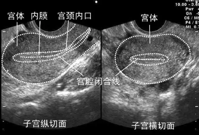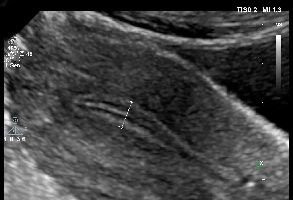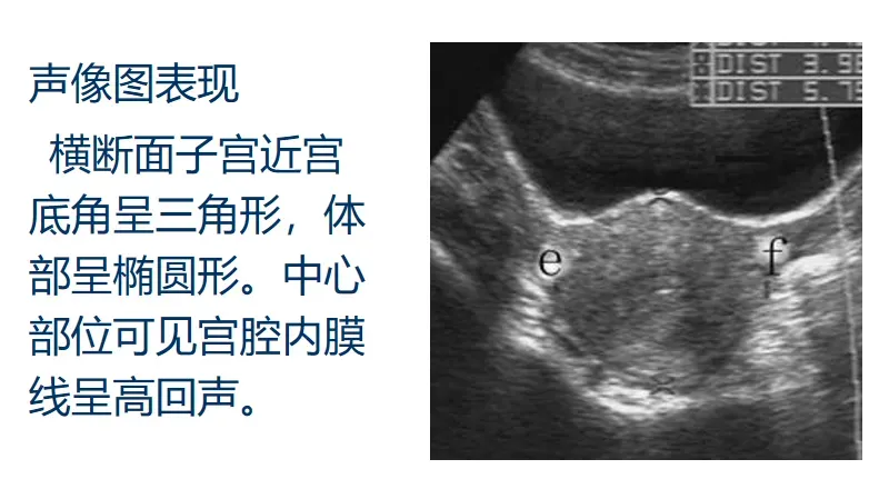 ★测量标准切面:取近子宫底部的横切面显示宫腔线最宽处