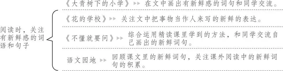如何关注“有新鲜感的词语和句子”?教学前就要明确何为“新鲜感”,明确了“新鲜”与“感受”的定义和密切关联及关注其本身的意义之所在以后,教学时才能做到有的放矢。教学本课时,我时刻注意尊重学生的主体意识,将教学难点层层分解,让学生先在多种形式的朗读教学活动中,渐渐明白“有新鲜感”的词语指什么,然后再尝试关注文中其他的有新鲜感的词句,接着进行学习方法的迁移运用,从同类文本阅读中,熟练发现有新鲜感的词句,最后根据图示,抓住自己学校的特点,练习仿说,说出有新鲜感的句子或段落。