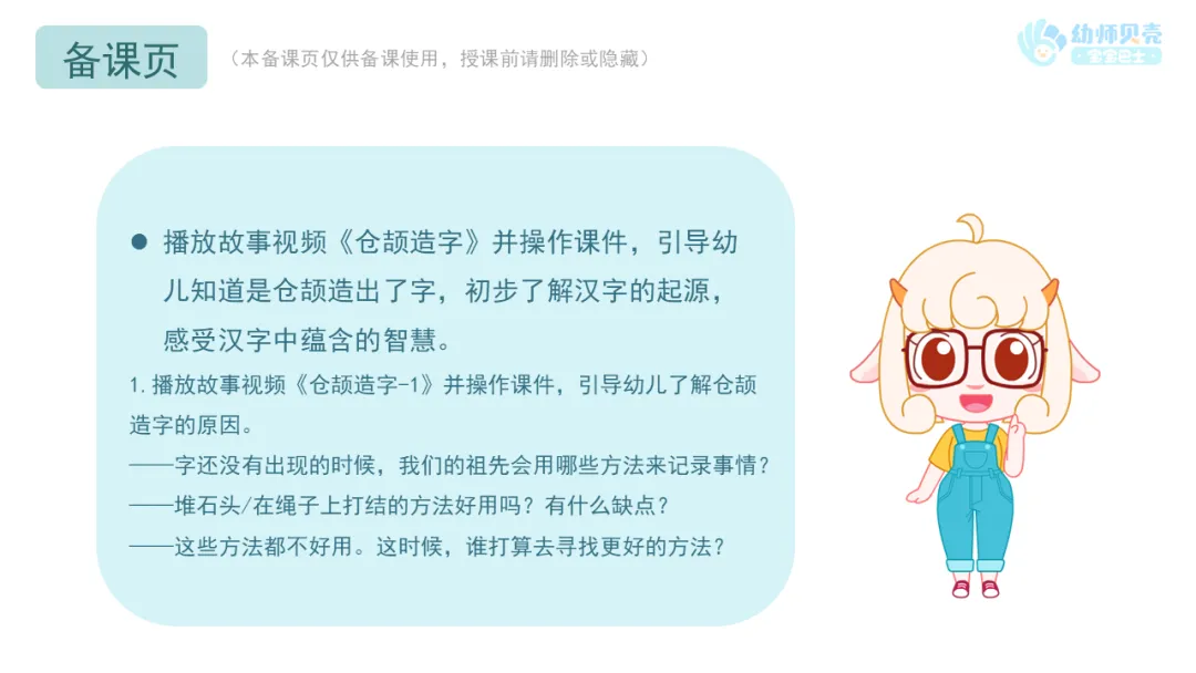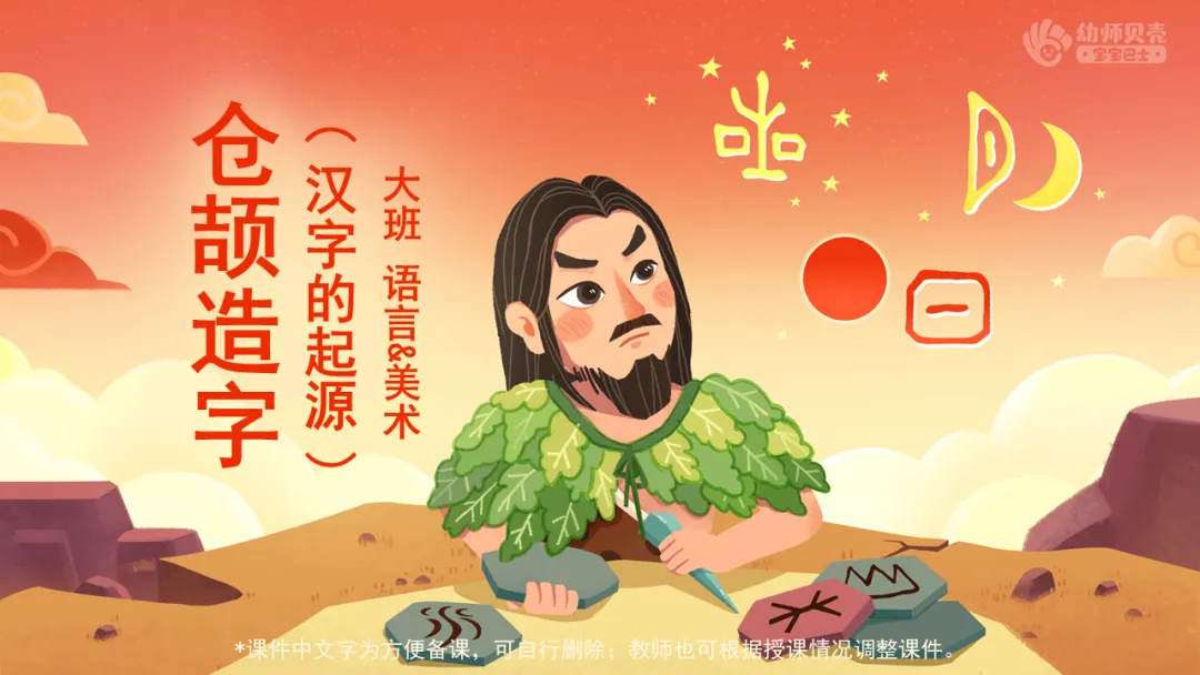l播放故事视频《仓颉造字》并操作课件,引导幼儿知道是仓颉造出了字,初步了解汉字的起源,感受汉字中蕴含的智慧。