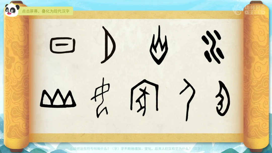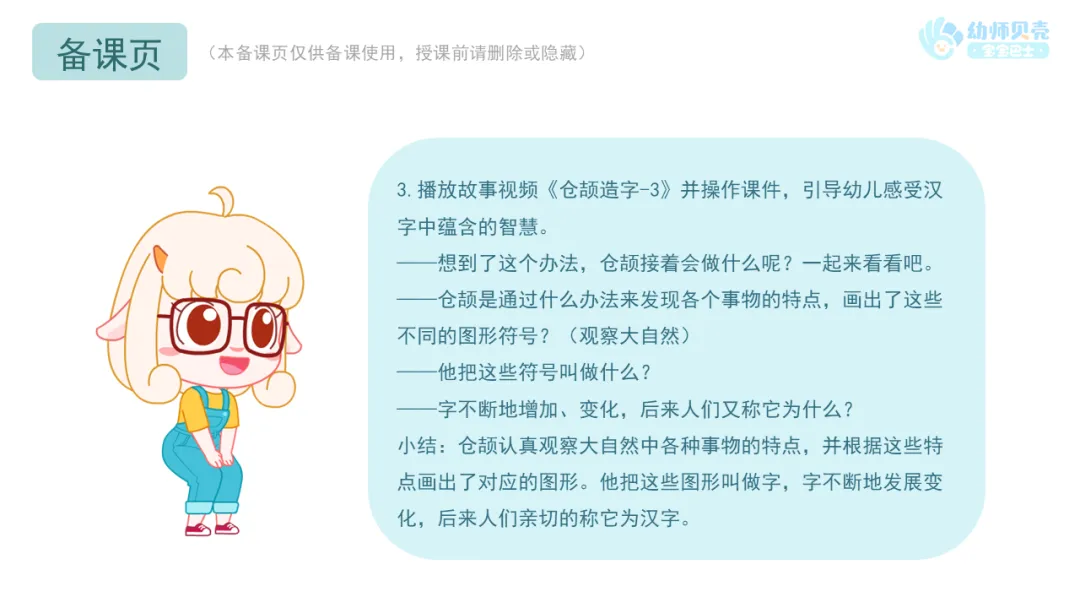3.播放故事视频《仓颉造字-3》并操作课件,引导幼儿感受汉字中蕴含的智慧。