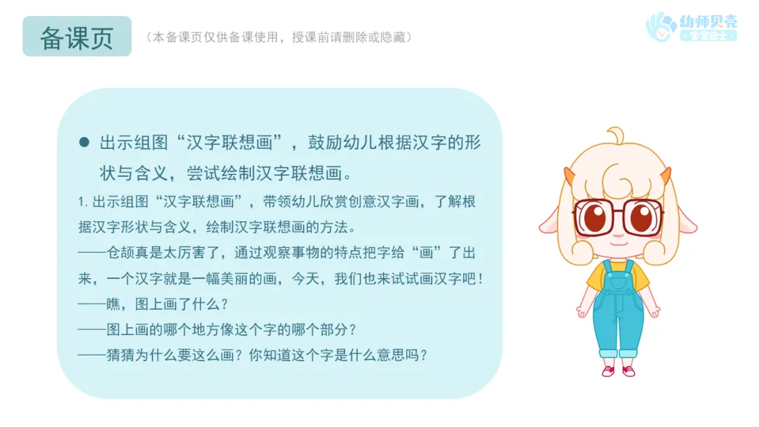 l课件准备:“绘本”组图;《仓颉造字》视频及组图;“汉字联想画”组图;“画汉字”组图。