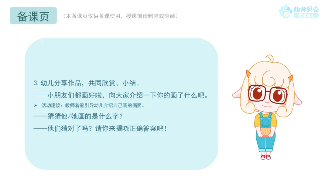 l经验准备:请家长在活动前利用空余时间带领幼儿认识一个简单的汉字,与幼儿讲解字表示的含义,并将这个字写下来带到幼儿园。