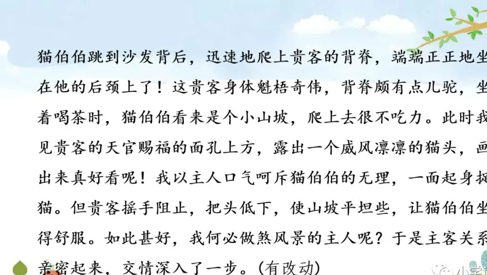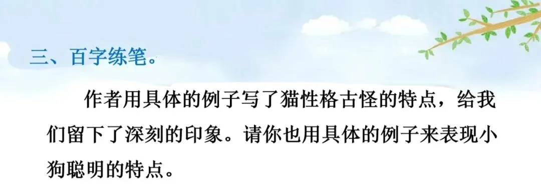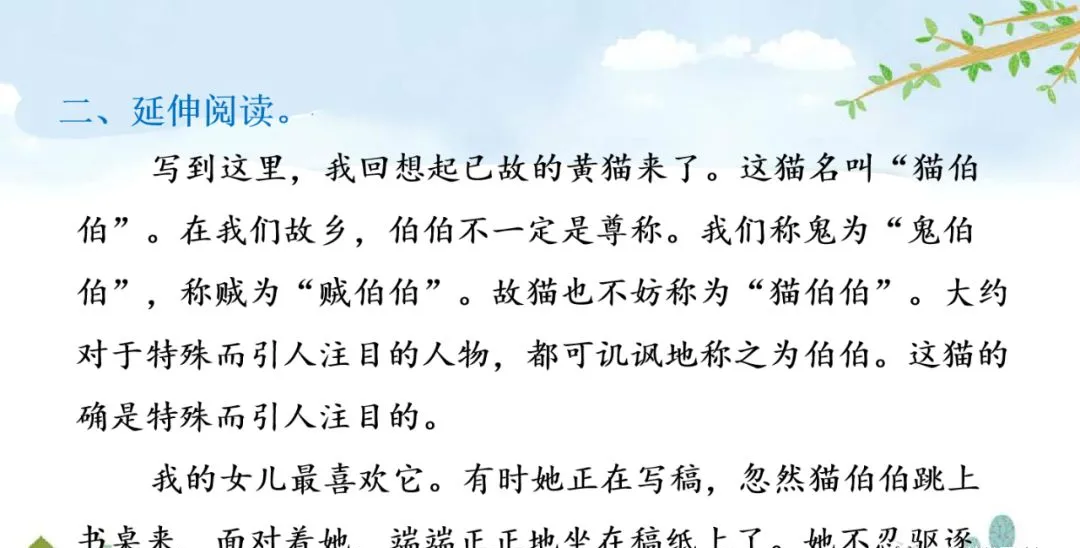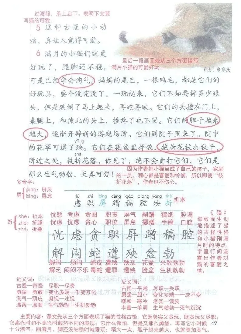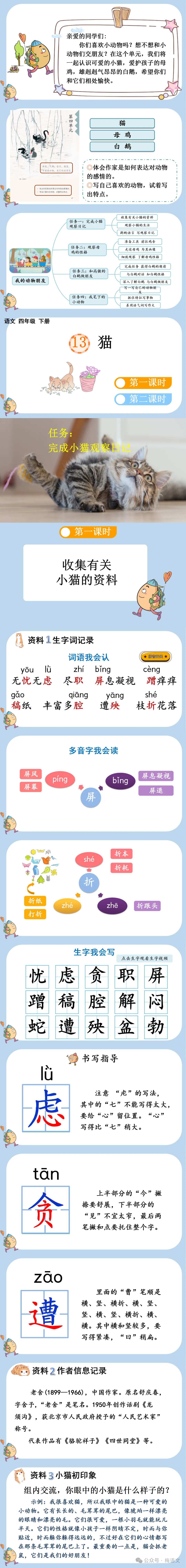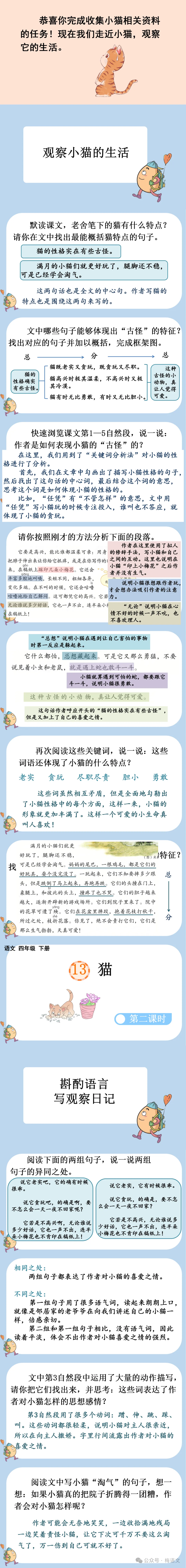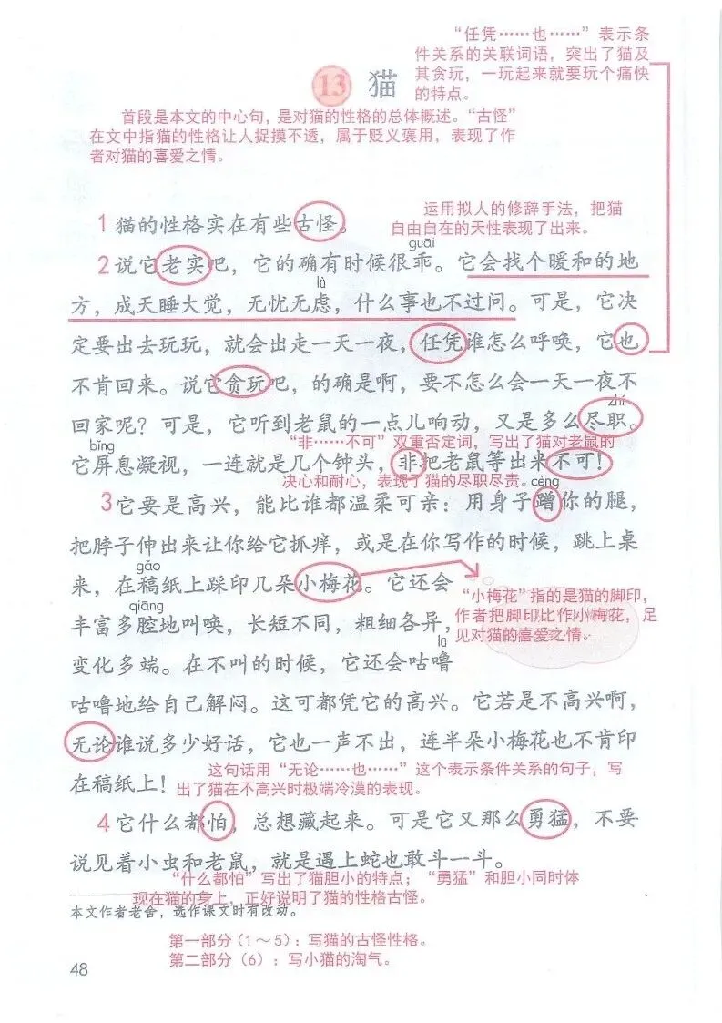 这篇精读课文细致、生动地描述了猫的古怪性格和它满月时的淘气可爱,全文字里行间流露出作者对猫的喜爱之情。课文先从三个方面具体表现猫的性格古怪:讲它既老实又贪玩,既贪玩又尽职;讲它高兴时和不高兴时截然不同的表现;讲它“什么都怕”,但又那么“勇猛”。这三个方面的表现,看起来相互矛盾,但都是事实,所以说猫的性格实在有些古怪。再讲它小时候十分淘气。表现在:一是刚满月,腿脚还站不稳时就爱玩;二是稍大一点胆子越来越大,也就更加淘气。这篇课文有两个非常突出的特点。首先是表达了真挚的感情。其次是老舍先生平实无雕琢的语言风格。老舍(1899—1966)原名舒庆春,字舍予,满族人,中国现代著名作家,杰出的语言大师,中华人民共和国成立后第一位获得“人民艺术家” 称号的作家。主要作品:《骆驼祥子》 《四世同堂》 《茶馆》等。1.尽职:努力做好本职工作。猫的天职就是捉老鼠,文中写猫在捉老鼠时既警觉又有决心和耐心,所以说它在尽心尽力地做好本职工作。2.古怪:跟一般情况很不相同,使人觉得诧异的;稀奇罕见的。5.丰富多腔:本课指猫的腔调丰富,会各种各样的声音。6.变化多端:变化多样。作家笔下的这只猫的叫声长短不同,粗细各异,富有变化。7.生气勃勃:充满生机与活力。文中意在表现猫的天真可爱、淘气顽皮及作者的喜爱之情。第一部分(1-5):按“总—分—总”式结构介绍猫的古怪性格。“古怪”是指跟一般情况很不相同,或生疏罕见,使人觉得诧异,在本文中是指猫的性格让人难以捉摸。这句话是前三个自然段的中心句,是对猫的性格的集中概括。这句话明贬实褒,表现出作者对猫的喜爱之情。“任凭”是“无论、不管”的意思,这句话用“任凭……也……”这组关联词语,突出了猫的极其贪玩,一玩起来就要玩个痛痛快快。3.它屏息凝视,一连就是几个钟头,非把老鼠等出来不可!“非……不可……”这个双重否定句写出了猫等老鼠的决心和耐心,突出表现了猫的尽职尽责,这与之前的贪玩看似互相矛盾,但都是事实,正好明的性格古怪。4.它还会丰富多腔地叫唤,长短不同,粗细各异,变化多端。“丰富多腔”“长短不同”“粗细各异”“变化多端”表现了猫的叫声变化多样的特点,表达了作者对猫的欣赏与喜爱。4.它若是不高兴啊,无论谁说多少好话,它也一声不出。“无论”用来表示条件不同而结果不变。这句话写出了猫在不高兴时极端冷漠的表现,可以替换为“任凭……也……”。5.小猫满月的时候更可爱,腿脚还不稳,可是已经学会淘气。这是本段中起承上启下作用的过渡句,表明下文将重点写小猫“可爱”“淘气”的特点。2.它要是高兴,能比谁都温柔可亲:用身子蹭你的腿,把脖子伸出来让你给它抓痒,或是在你写作的时候,跳上桌来,在稿纸上踩印几朵小梅花。“蹭”换成“碰”“几朵小梅花”换成“几个小脚印”好不好, 为什么?“蹭”是轻轻的磨擦,蹭出了猫的可爱,蹭出了撒娇,蹭出了温柔,蹭出了高兴蹭出了作者对猫的喜爱。“蹭”表现了猫似乎在撒娇、耍赖,写出了猫与主人的亲昵。一个“印”字反映了主人对猫的万般喜爱。同时采用比喻的修辞方法,把猫踩在稿纸上的爪印比作美丽的“小梅花”,表达了作者对猫的喜爱之情。3.它什么都怕,总想藏起来。可是它又那么勇猛,不要说见着小虫和老鼠,就是遇上蛇也敢斗一斗。这段话里说猫“什么都怕”又说它“勇猛”前后矛盾吗? 为什么?不矛盾。因为这正好揭示了猫古怪的性格。胆小与勇猛同时体现在猫的身上也就不足为奇了。猫小时候十分淘气可爱。 表现在:一是刚满月,腿脚还站不稳时就爱玩。二是玩起来不怕摔跟头,也不怕疼。三是稍大一点,胆子越来越大,也就更加淘气。作者运用具体事例写出了猫的性格特点。写猫老实时,列举猫“成天睡大觉、无忧无虑、什么事也不过问”的事例。写猫贪玩时,列举猫一天一夜不回家的事例、写猫尽职时,列举了猫“一连就是几个钟头”蹲守“非把老鼠等出来不可”的事例,都具体表现了猫古怪的性格。写猫小时候淘气可爱,列举了它玩鸡毛、玩线团、摔跤、打秋千等具体事例来表现。本文生动地描述了猫的古怪性格和小猫满月时的淘气可爱的特点,表达了作者对猫的喜爱之情。1.默读课文,说说课文围绕猫的可爱讲了哪几层意思。课文的第6自然段围绕满月时的小猫可爱、淘气的特点讲了三层意思:鸡毛、线团都能玩个不停,胆子越来越大,抱着花枝荡秋千。2.举例说说可以从哪些地方看出作者非常喜欢猫,再把你的体会有感情地读出来。作者喜欢猫,从以下两个方面看出来:一是猫的特点:老实又贪玩,又尽职的古怪的性格、高兴时温柔可亲,不高兴时一声也不出、胆小而又勇猛好斗、满月的小猫淘气、可爱。二是老舍先生对家里的猫爱同儿女,因此无论猫是古怪还是淘气,在他眼里都是十足的可爱。而且人与猫之间互相信任,和谐相处,创造出一个非常美好的境界。在介绍猫的性格特点时,老舍先生的语言平实、质朴,运用具体的事例展现了猫的灵性、古怪、可爱。说它老实吧,它的确有时候很乖。它会找个暖和的地方,成天睡大觉,无忧无虑,什么事也不过问。可是,它决定要出去玩玩,就会出走一天一夜,任凭谁怎么呼唤,它也不肯回来。作者觉得猫像顽皮可爱的小孩似的,性格古怪,所以运用了拟人的手法,说明作