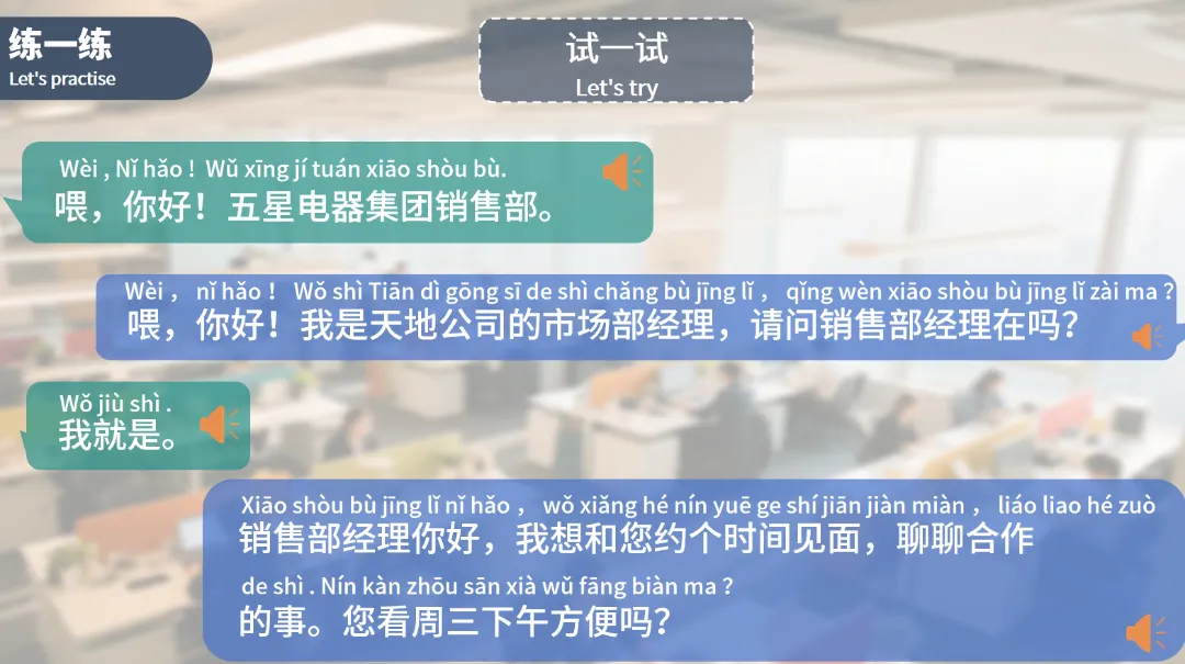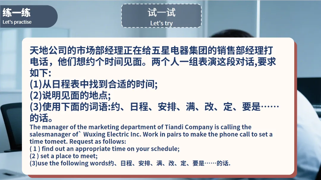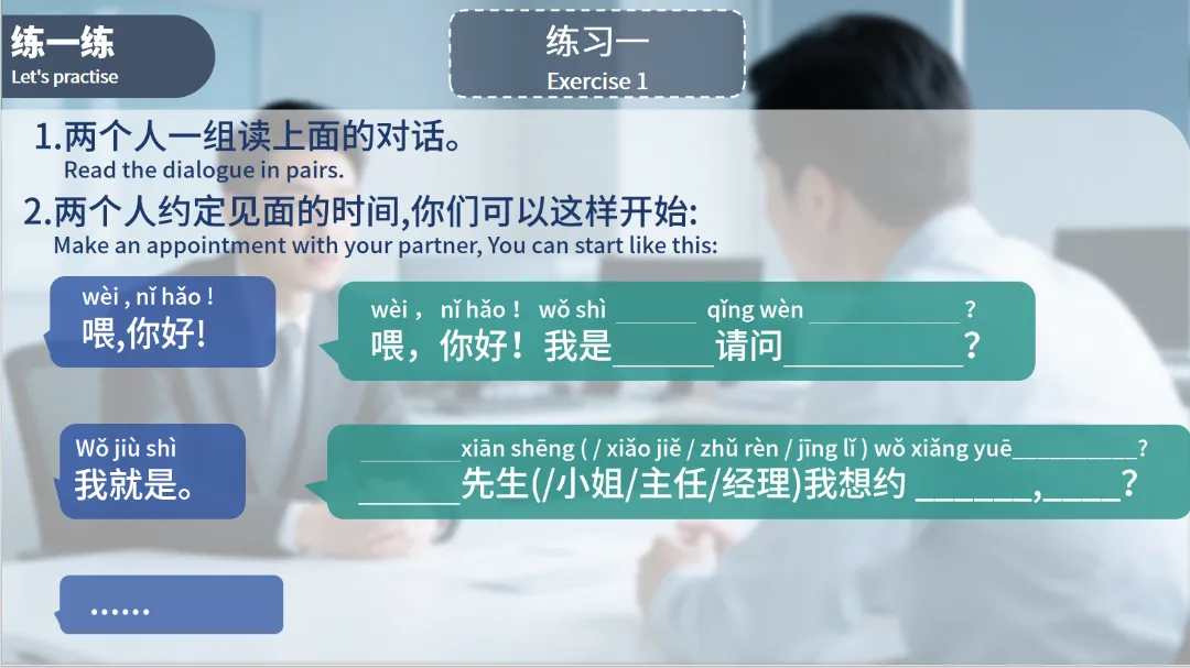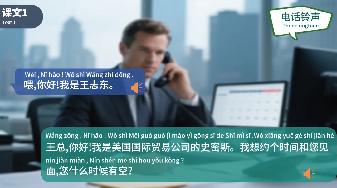 今天,我们将为您介绍一款专为商务人士设计的对外汉语课件——新丝路商务汉语中级《我想约个时间和你见面》,帮助学生熟练掌握商务场合中的汉语应用。