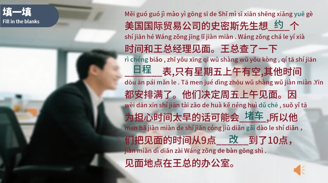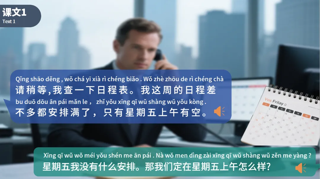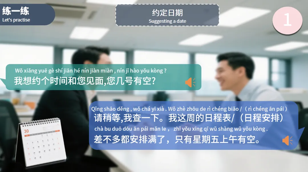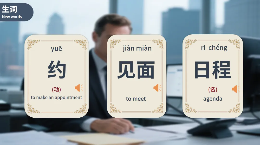 今天的课程聚焦于商务约会安排的常用表达,通过生动的对话和丰富的练习,让学生轻松学会如何用汉语进行商务约见。