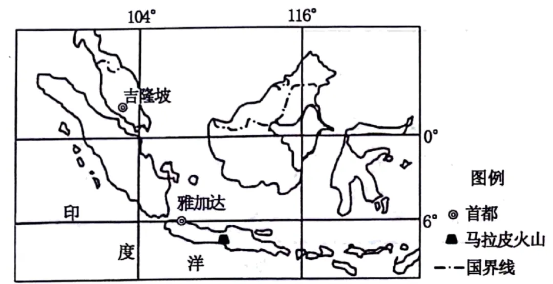 据印度尼西亚火山监测机构2023年报告,苏门答腊岛马拉皮火山(属环太平洋火山带)于2023年1月7日剧烈喷发,喷发柱高达5千米。历史上该火山平均每百年发生3次大规模喷发,其喷出物形成的肥沃土壤曾支撑了当地农业文明。下图为印度尼西亚马拉皮火山位置示意图。据此完成下面小题。