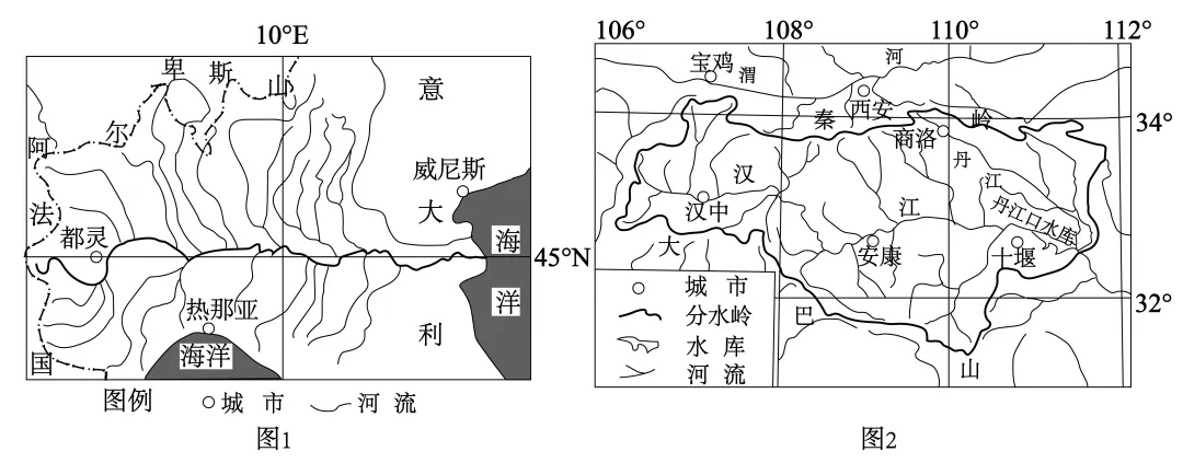 图1为意大利波河流域示意图,图2为我国汉江上游流域水系示意图。波河流域北有阿尔卑斯山脉,汉江上游流域北有秦岭,两山脉对河流流量都产生影响。据此完成下面小题。