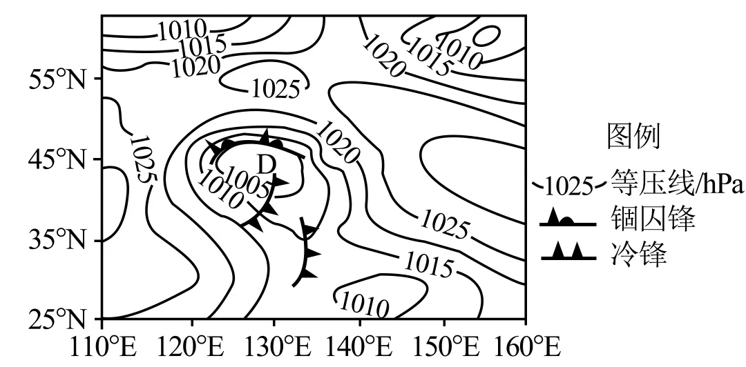 2021年11月,蒙古高原冷空气南下与黄海暖湿气流交汇,在我国华北地区形成锢囚型温带气旋后,并继续发展。气象部门观测显示:该气旋属SK型锢囚(暖锋后弯型),其发展过程中冷锋加速追上暖锋,将暖空气完全抬离地面。锢囚锋形成后,气旋西北象限出现持续性强降雪,24小时积雪深度达25厘米,导致多条高速公路封闭。研究表明,此类气旋的降水强度、范围与锢囚方式及暖湿气流输送密切相关。下图为2021年11月9日8时亚洲部分区域海平面等压线分布示意图。据此完成下面小题。