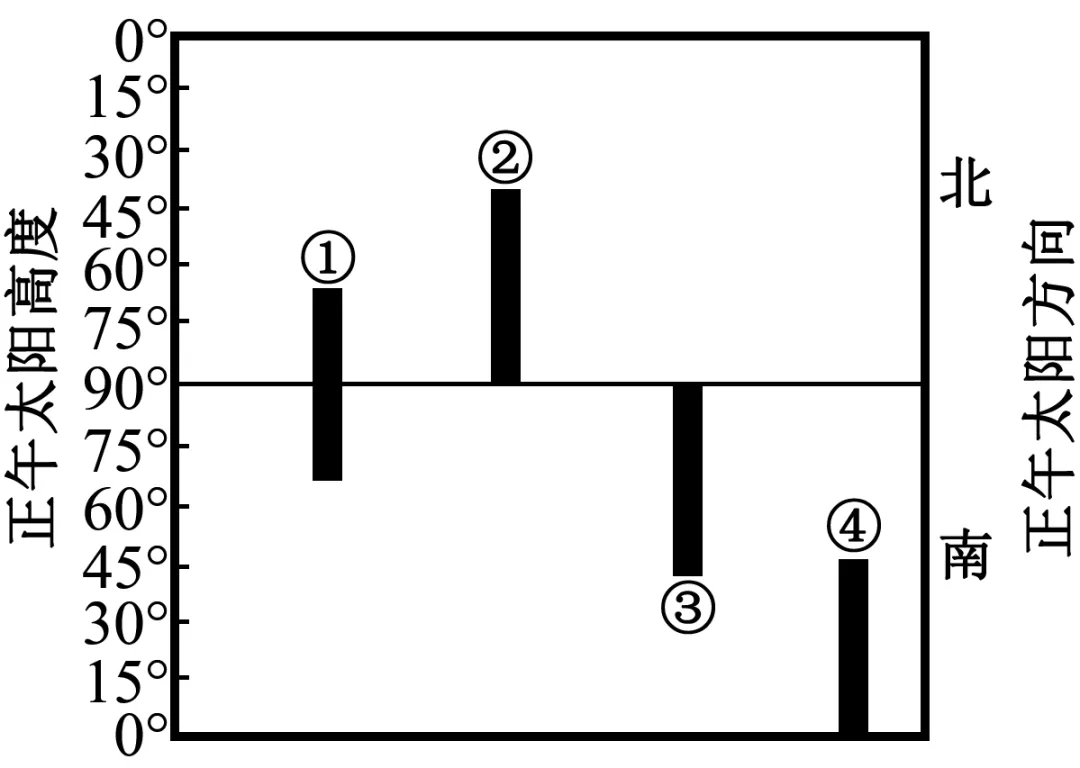 下图为地球上四个特殊纬度地点年内正午太阳高度变化及正午太阳方向示意图。据此完成下面小题。