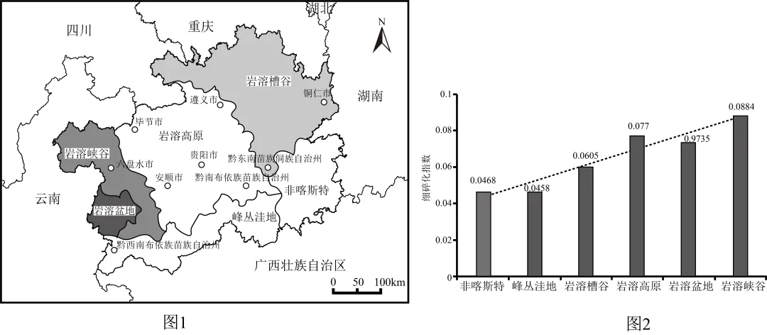 贵州省地处云贵高原,地貌类型复杂多样。不同地貌区的耕地空间形态差异显著,耕地细碎化问题突出。耕地细碎化使得农业生产难以实现规模化、机械化经营,土地利用效率不高,对粮食安全构成潜在威胁。在保障生态安全的前提下,如何优化耕地利用、保障粮食安全成为当地面临的重要课题。图1为贵州省不同地貌类型分布示意图。图2为不同地貌类型区耕地空间形态细碎化指数均值示意图(细碎化指数越高,耕地细碎化程度越大)。