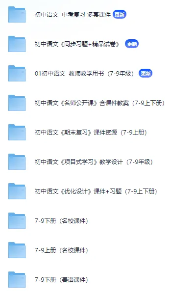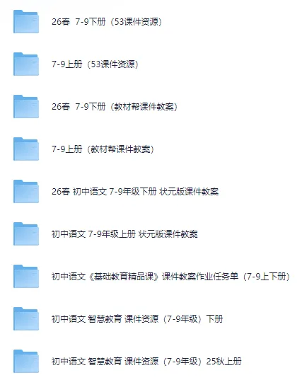 本文收集的资源是26春初中语文课件教案教学设计教学用书免费下载链接|人教版部编版多套|七八九年级上下册备课资料最新优质资源,内容丰富全面存放于网盘,网盘部分资源截图如下: |
