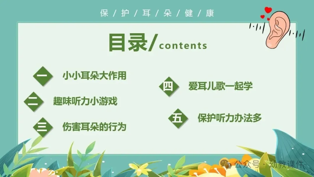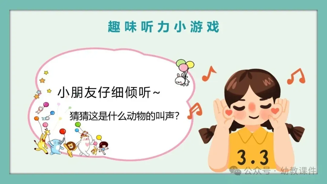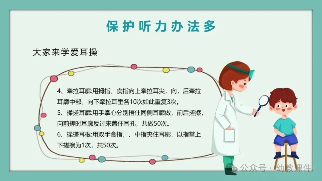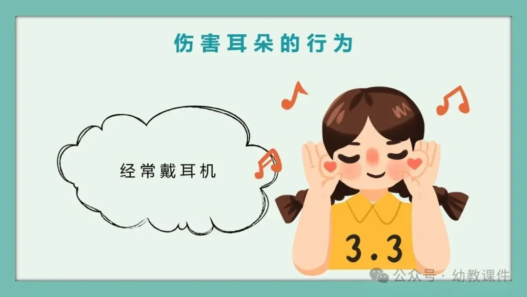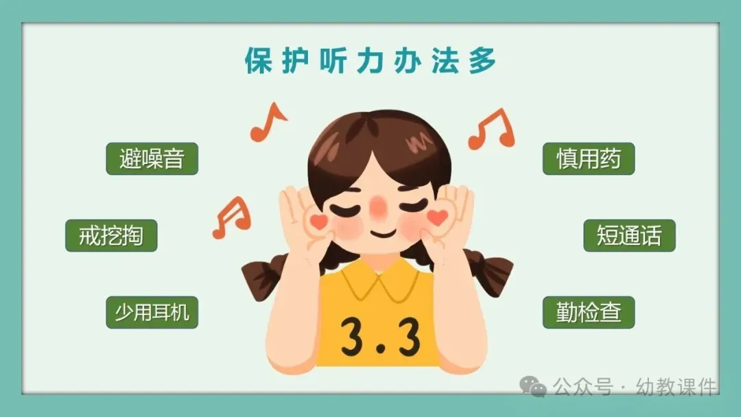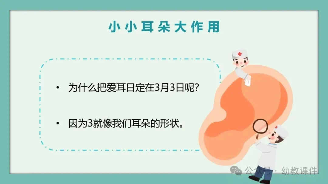进一步提问:“为什么爱耳日定在3月3日呢?”结合PPT内容告诉幼儿,因为数字3的形状就像我们的小耳朵,让幼儿直观感知节日的由来。