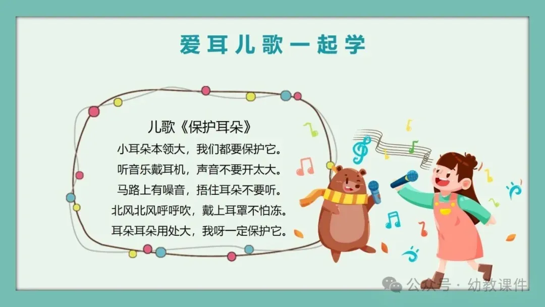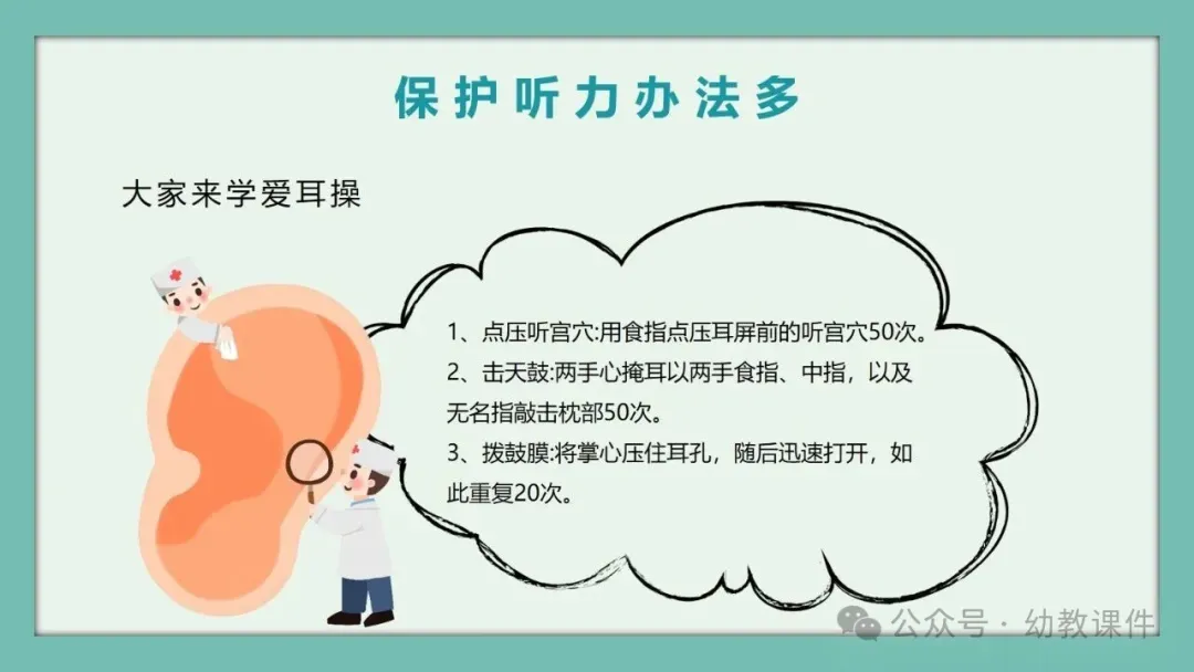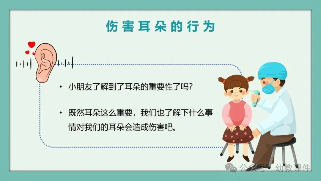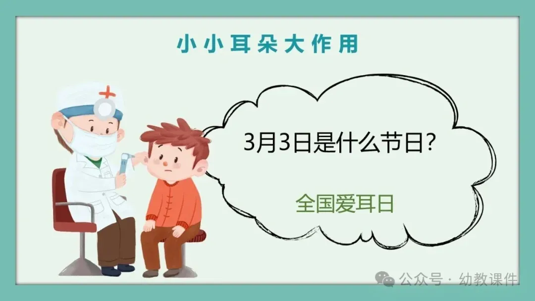 教师提问:“小朋友们都有耳朵,那你们知道有一个专门保护耳朵的节日吗?”引导幼儿自由发言后,揭晓答案:3月3日是全国爱耳日,并出示相关图片。