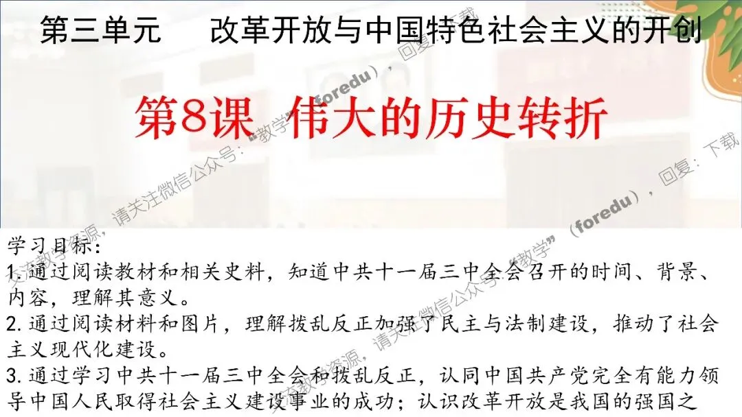 当前位置:首页>课件>2026春八年级下册历史新教材课件:8 伟大的历史转折