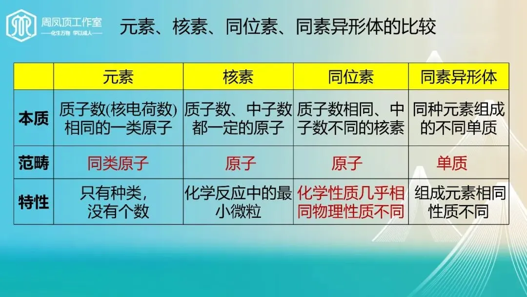 设计亮点:通过对比“元素、核素、同位素、同素异形体”的概念,帮助学生建立知识结构,形成系统思维。