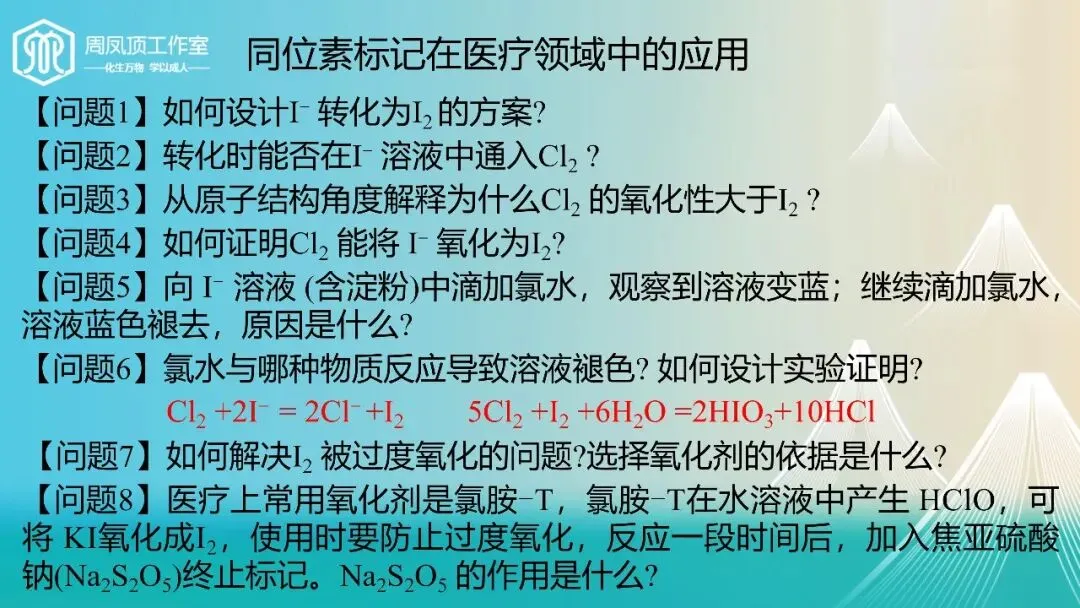 设计亮点:结合“同位素标记在医疗领域中的应用”这一真实科研情境,设计多个探究性问题,如“如何解决I2被过度氧化的问题”“Na2S2O5的作用是什么”。