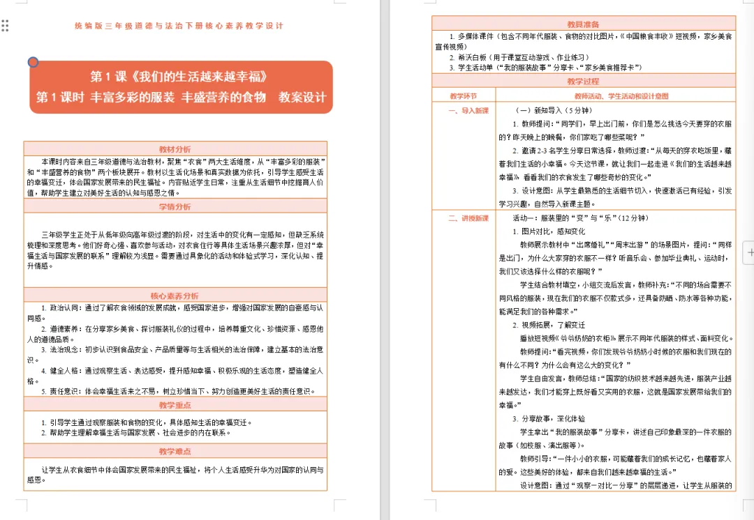 【道德与法治教案课件】新教材部编版小学道德与法治三年级下册全册核心素养表格配套教案(含反思)第1课《我们的生活越来越幸福》