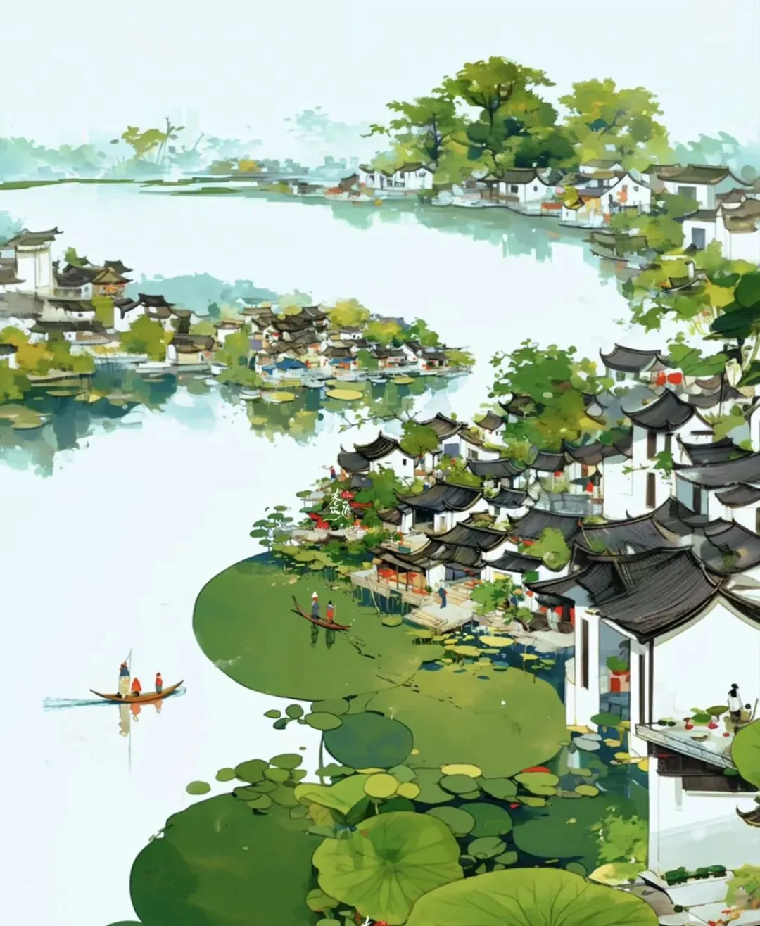 5. 添细节:画乌篷船、水面波纹、小燕子,让画面更生动。