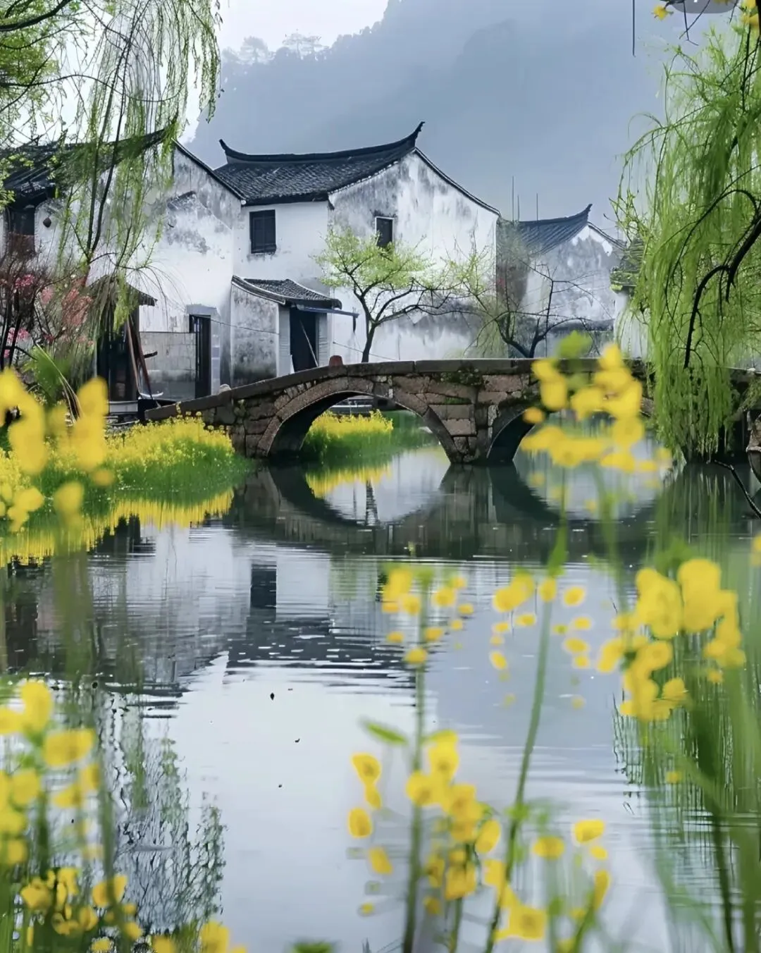 播放江南春色短视频,展示小桥流水、嫩柳、粉桃、乌篷船,让孩子直观感受:江南的房子是白白的墙、黑黑的顶,水清清的,树绿绿的,春天特别温柔。