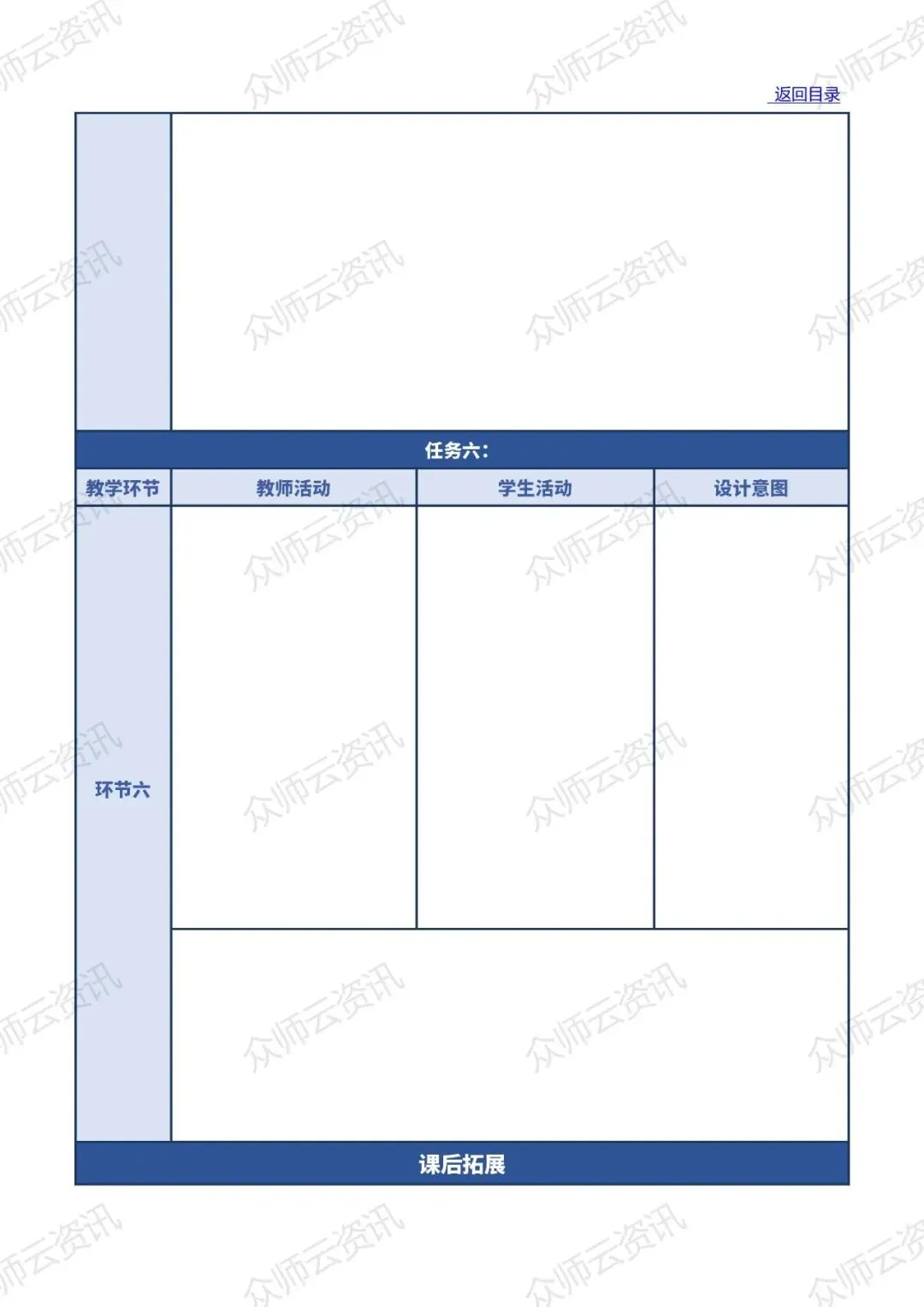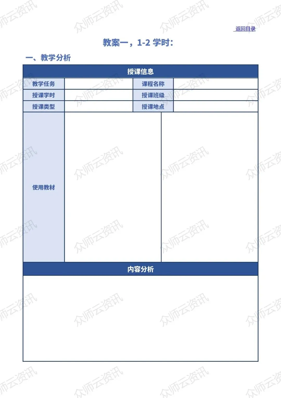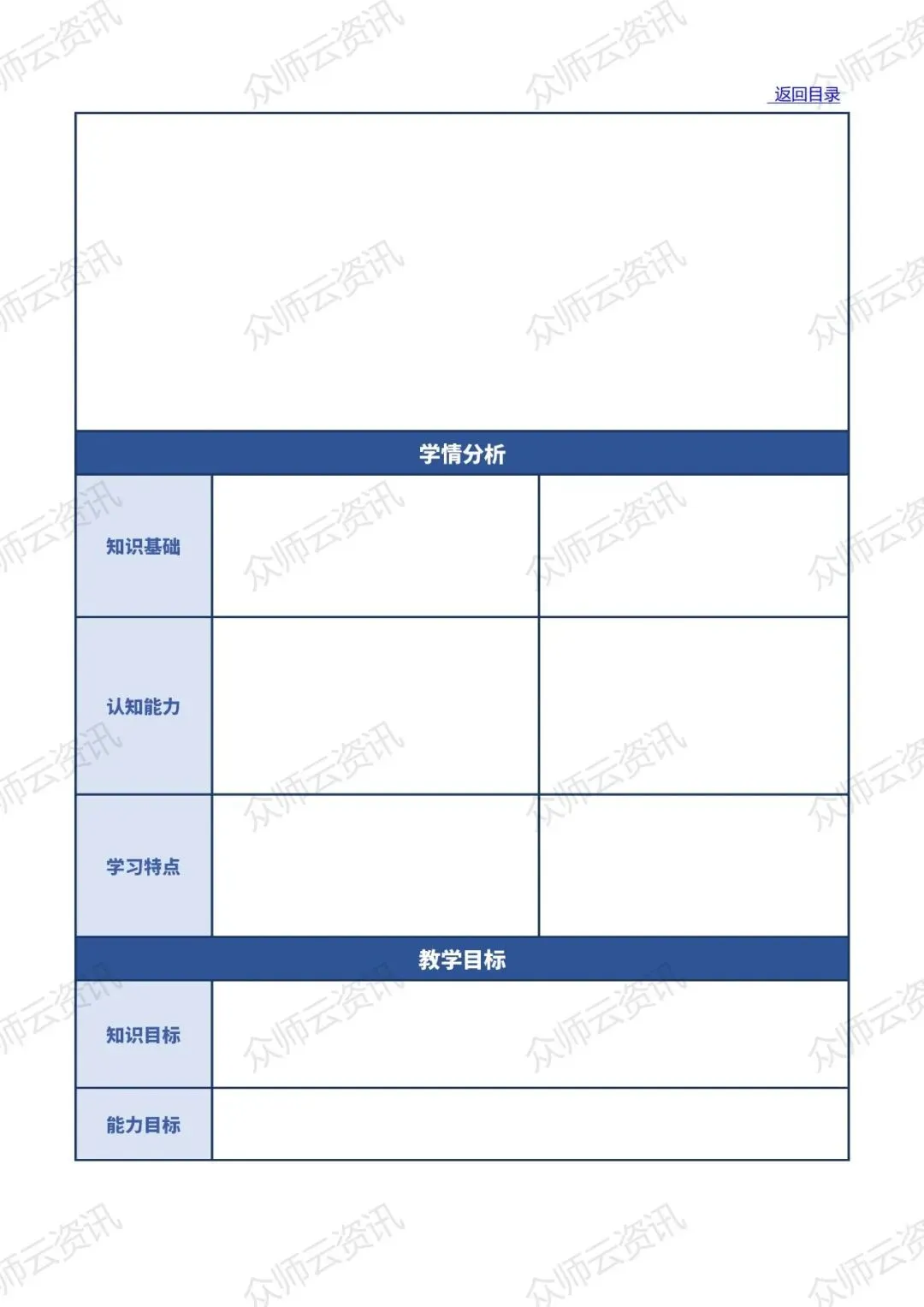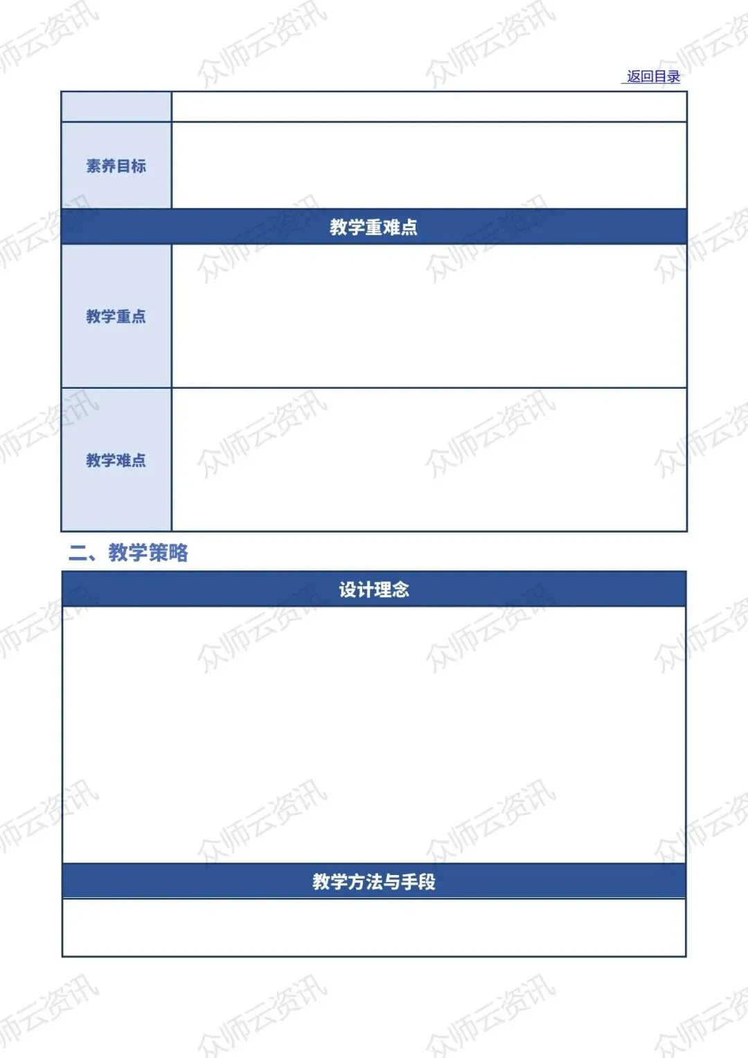很多老师写完了教案,在合并时,表格排版搞不定,目录设计总不对,返回目录不会做,关键是封面没图片,白底黑字,过于朴素。今天给老师分享一份空白教案,封面、目录、框架、底色、返回,一整套都全部设计好,只需要填写文字进入即可成型一份的参赛材料,助力老师事半功倍。