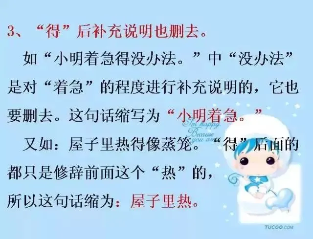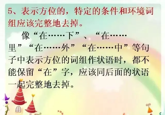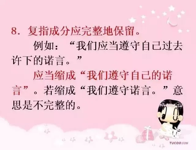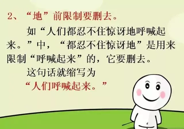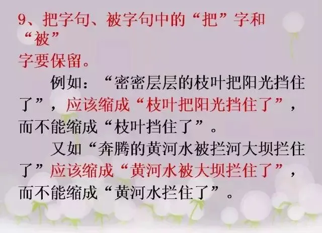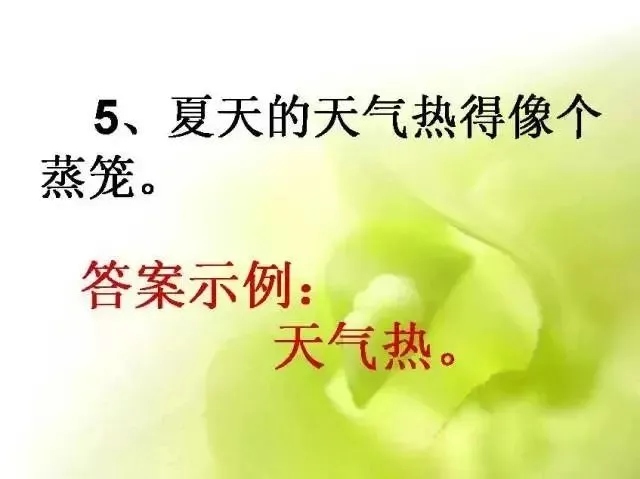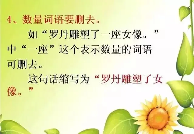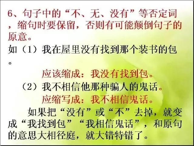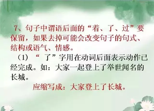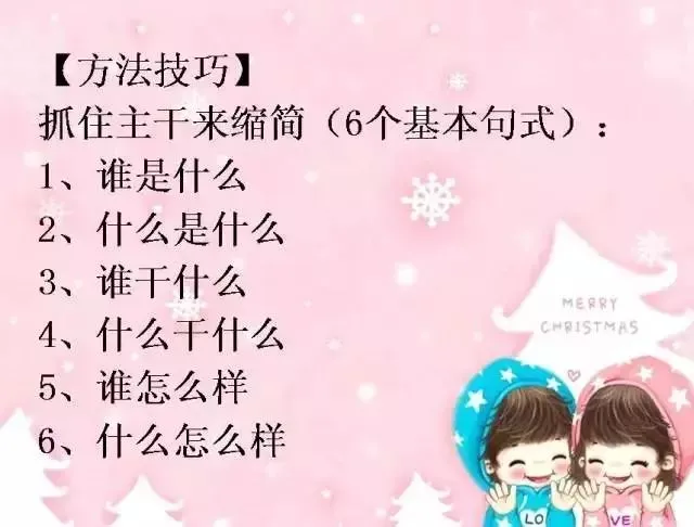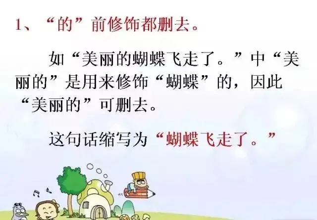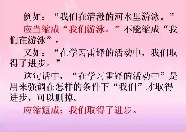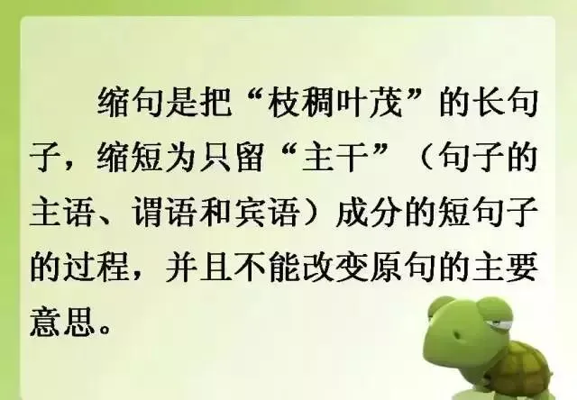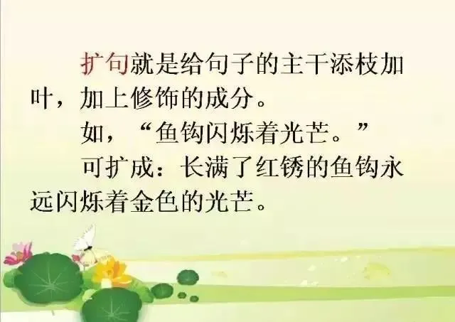 缩句,就是把“枝稠叶茂”的长句子,缩短为只留“主干”的短句子,并且不能改变原句的主要意思。无论多么复杂的单句,只要层层压缩,就会越来越简单,最后剩下的就是这个句子的“主干”。换句话说,“主干”就是把所有的定语、状语、补语都压缩了之后余下的部分。如:嘴角嫩黄、头上长着绒毛的小麻雀无可奈何地拍打着翅膀。经过缩句,抓住句子的主干“小麻雀拍打着翅膀。”就知道这句话是写小麻雀。“六·一”节前夕,宁宁光荣地被评为“三好学生”的称号。这句话一经缩句成为:“宁宁被评为称号。”我们就会发现这句话是错的,”被评为称号”词语搭配不当。缩句时,要先找出句子的主语、谓语、宾语,再逐步删去它们前面的修饰成份,直至缩干净为止。“在……上(中、里、下)”等表示特定的条件和环境的词语应删去。如:金黄色的沙滩上有许多五颜六色的贝壳。沙滩上有许多五颜六色的贝壳。沙滩上有许多贝壳。沙滩上有贝壳。我最爱看天上亮晶晶的星星。我最爱看天上的星星。我最爱看星星。我爱看星星。在老师的帮助下,我完成了作业。我完成了作业。先看看这句话是写人还是写景物的,然后可以提出“谁是什么”、“谁干什么”、“谁怎么样”或者“什么是什么”、“什么干什么”、“什么怎么样”来找出句子的主要部分。如:“满头白发的老奶奶拄着拐杖,焦急而又耐心地等待着周总理的灵车。”这是一个长句,我们就可以提问:谁——老奶奶;干什么——等待灵车。缩句后就成为:“老奶奶等待灵车。”又如:“这毛茸茸的在地上流动着的小绒球原来是刚孵出来的小鸡。”我们可提问:什么——小绒球;是什么——是小鸡。缩句后就成为:“小绒球是小鸡。”有些句子很长,修饰的部分较多,我们就要在几个词语中选出主要的,才能正确地缩句。如“工人宿舍前的草地上开满了五颜六色的野花。”因为“野花”只能开在“草地上”。所以“草地上”是主要词,而“工人宿舍前”是修饰“草地”的。3、如果是否定句缩句,就要把否定词一起写出来,否则就会改变句意。如“我不相信他那种骗人的鬼话。”应缩成“我不相信鬼话”,而不能缩成“我相信鬼话”。(2)找出句子最后一个词语(去掉助词“的”字后变的内容后),如果是动词,那么句子就缩成两部分:人物+最后一个词;如果不是动词,还要找出一个动词出来,句子就缩成三部分:人物+动词+最后一个词。(3)一般情况下不保留“的”“地”前边的词语,还有“得”字后面的词语。扩句与缩句刚好相反,它是在主干的基础上添枝加叶,也就是说,根据表达的需要添加上定语、状语、补语等连带成份,使句子的意思更具体形象。如:太阳升起。金色的太阳从东方地平线缓缓升起。在这里第二句就比第一句具体、形象得多。进行扩句练习时,首先必须弄清楚句子的主要成分,即找到句子的主语、谓语、宾语,在它们的前面加上适当的修饰,而且一个地方可以加不止一个“枝叶”,这样的句子才会更加完整、具体。如:天空挂着月亮。深蓝的天空中高高地挂着一轮玉盘似的月亮。即把句子分成两部分——主语部分和谓语部分,先扩前面部分,再扩后面部分。如“小明读书”,前面部分是“小明”,先补充小明 是谁,与我的关系,这样前面部分可扩充为“我的同学小明”;后面部分可补充“在什么地方”“怎样读书”,这样后半部分可补充为“在教室里认真地读书”。全句扩为“我的同学小明在教室里认真地读书”。就是把句子的两部分一下子扩充。如“红旗升起来了”,按 “什么样的”红旗“在什么地方”“怎么样地”升起来,可扩成“鲜艳的五星红旗在教学大楼的房顶上徐徐地升起来”。扩句时要根据表达需要合理增添有效的成份,不要生硬地堆砌意思相同的词语,不要前后重复,也不要改变原句的意思。在完成扩句作业或试题时,如果对扩充部分有具体规定的应按规定扩句,如没作规定的,可进行整体扩句。扩句后别忘了加标点。1、 原句:太阳光 照射着 树林。 扩句:( 晌午的) 太阳光(火辣辣地)照射着 (整个)树林。分析(1)原句的主要成分:“谁”——太阳光 ;“怎么样”——照射着树林。 (2)添加的词语及作用:“晌午”——表示时间的词语,起限制作用。 “火辣辣”——形容词,起修饰作用。 “整个”——起限制作用。2、 原句:青烟弥漫。 扩句 (飘飘荡荡的)青烟弥漫(在大地上)分析 (1)原句的主要成分:“谁”——青烟;“怎么样”——弥漫。 (2)添加的词语及作用:“飘飘荡荡”——形容词,起修饰作用。 “在大地上”——起补充说明的作用。