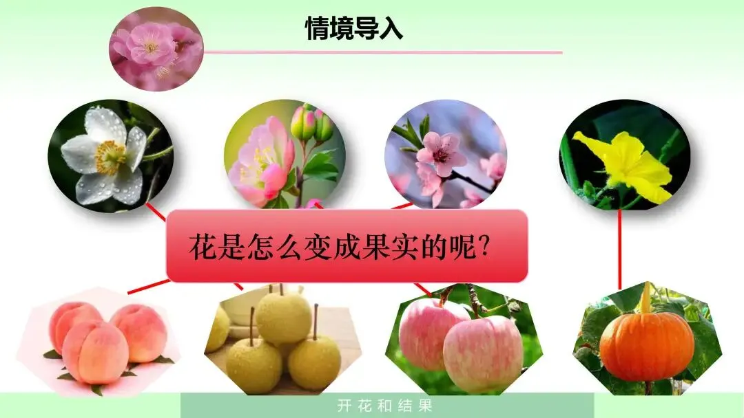 上课开始,我先出示花和果实的图片,创设情境,提出本节课的核心问题:“花是怎么变成果实的呢?”