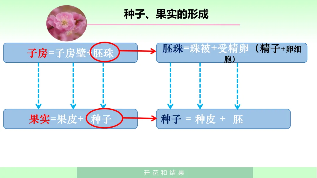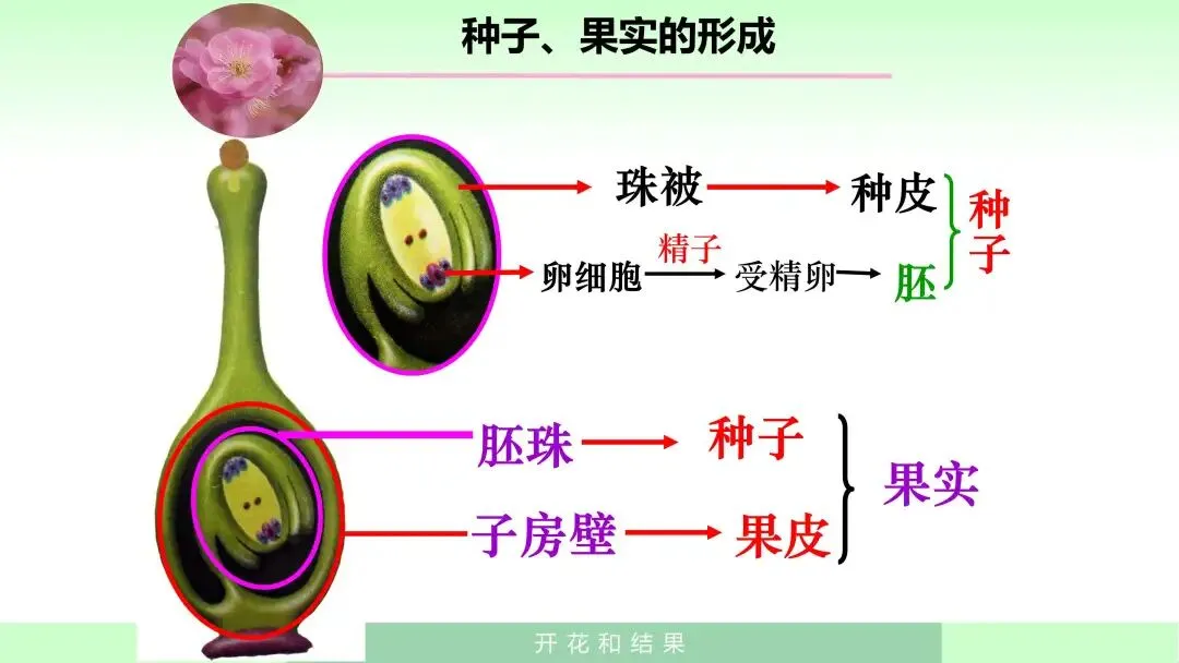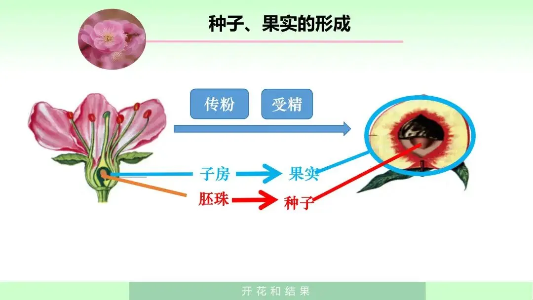 随后请学生用一句较完整的话概括“开花和结果”的基本过程。例如:“花开放后,经过传粉和受精,子房发育成果实,胚珠发育成种子。”