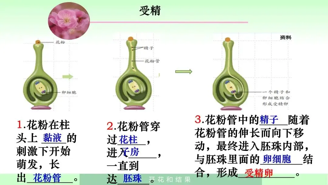 接下来,我重点讲解受精过程,并明确告诉学生:传粉不是受精,传粉只是受精的前提。