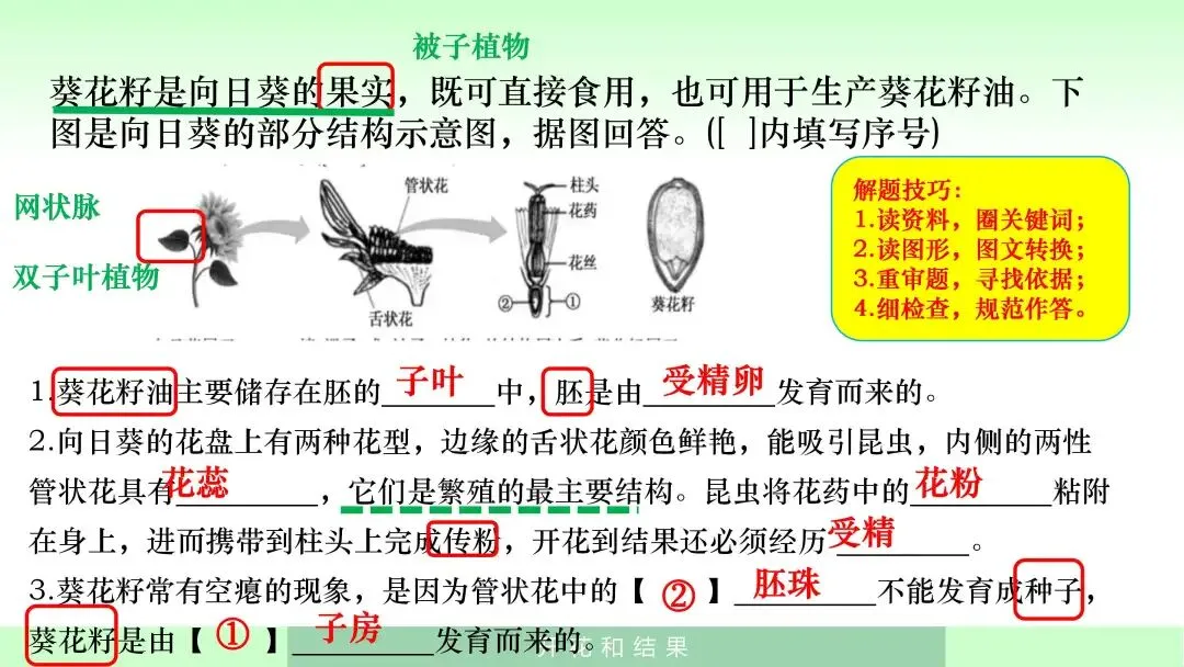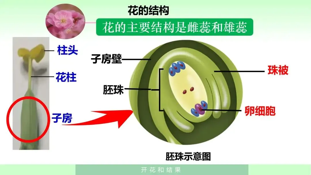 本节课的重点有三个:第一,花的主要结构及其功能,尤其是雌蕊和雄蕊;第二,传粉、受精和果实种子形成之间的逻辑关系;第三,子房、胚珠与果实、种子的对应关系。