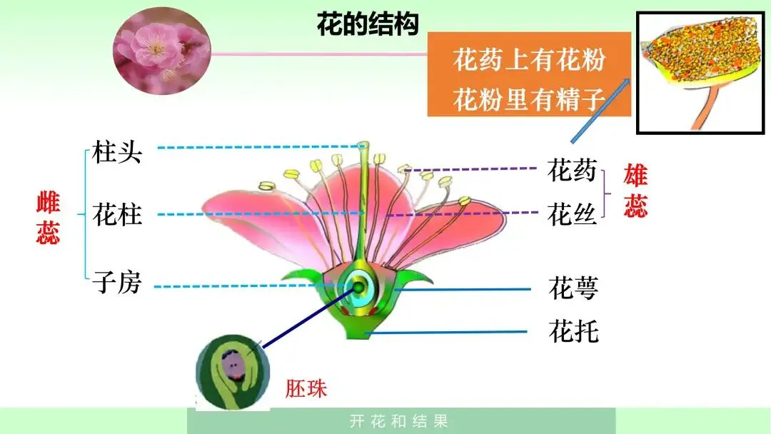 花的结构雄蕊:花药、花丝雌蕊:柱头、花柱、子房(内有胚珠)