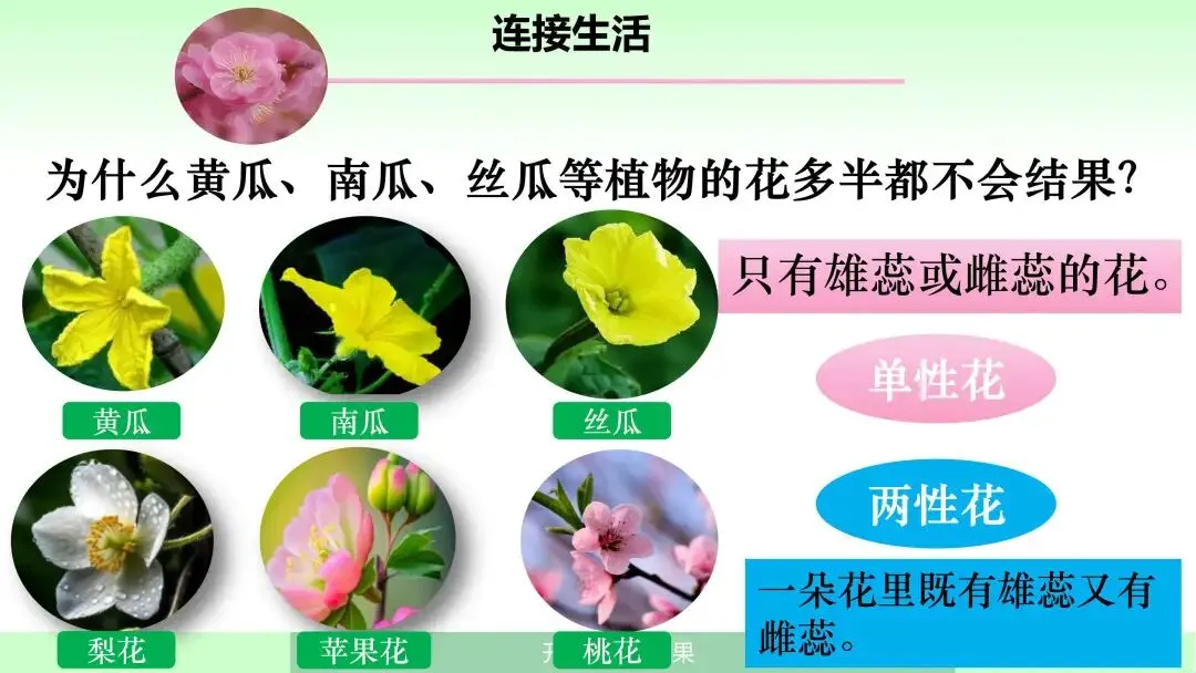 教师活动出示黄瓜、南瓜、丝瓜及梨花、苹果花、桃花图片,引导学生思考:“为什么黄瓜、南瓜、丝瓜等植物的花多半都不会结果?”讲解单性花、两性花的概念。
