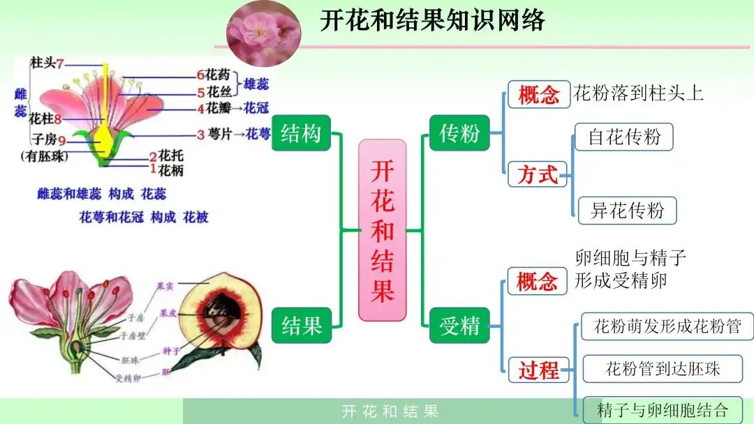 本节可概括为一条清晰主线:认识花的结构 → 理解传粉与受精 → 分析果实和种子的形成 → 联系生活现象进行迁移应用。