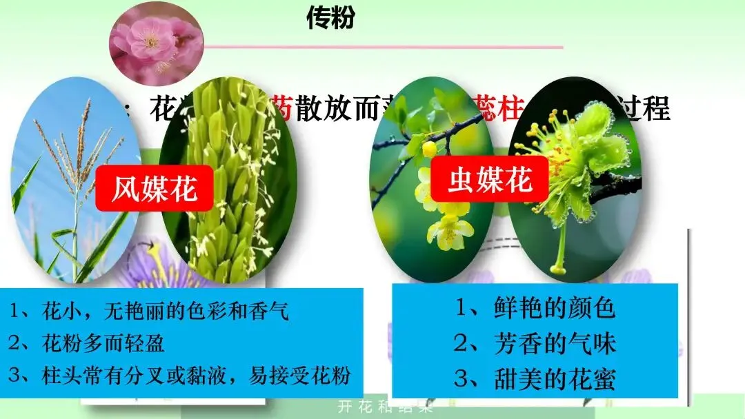 并结合图片简要比较风媒花和虫媒花的特点,让学生知道不同植物在传粉方式上存在差异。