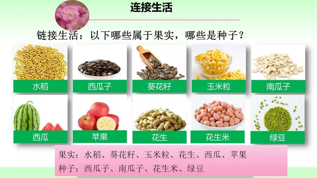 教师活动出示实例(如水稻、西瓜子、葵花籽、玉米粒、南瓜子、西瓜、苹果、花生、花生米、绿豆等),组织学生分类。引导学生依据生物学概念判断,而不是只看生活名称。