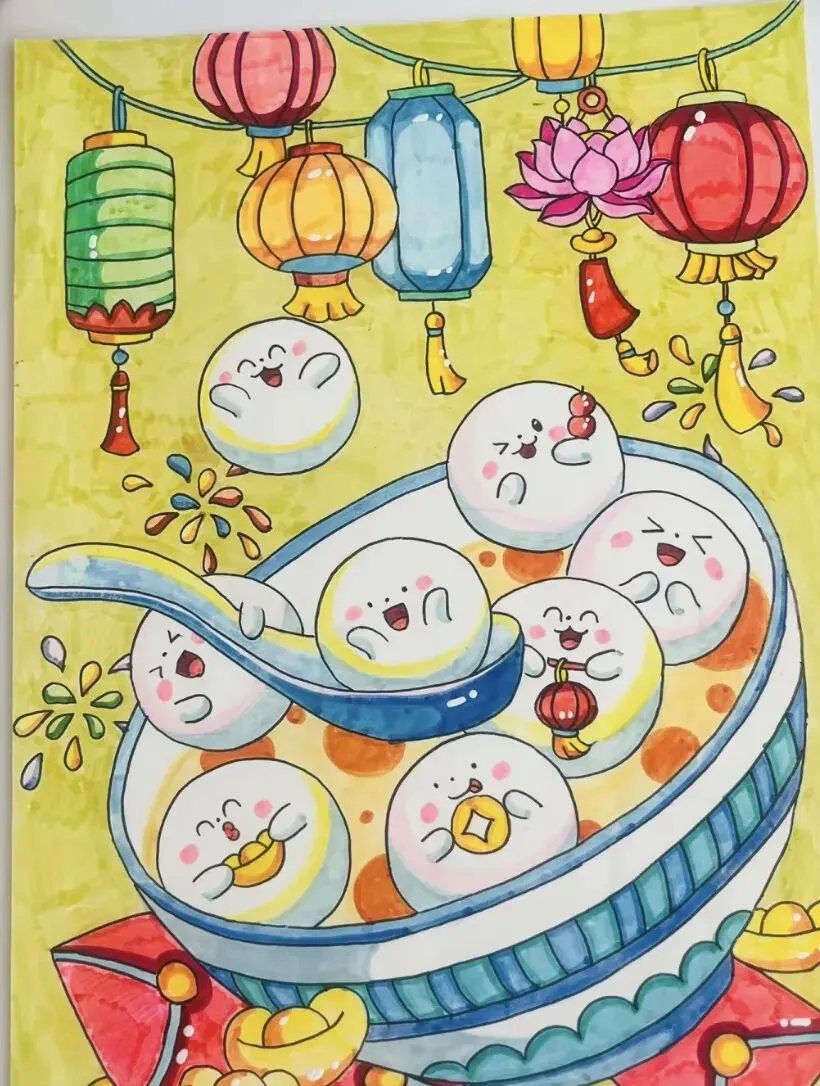 2. 人物:小朋友赏花灯、猜灯谜、吃汤圆,脸上笑眯眯。