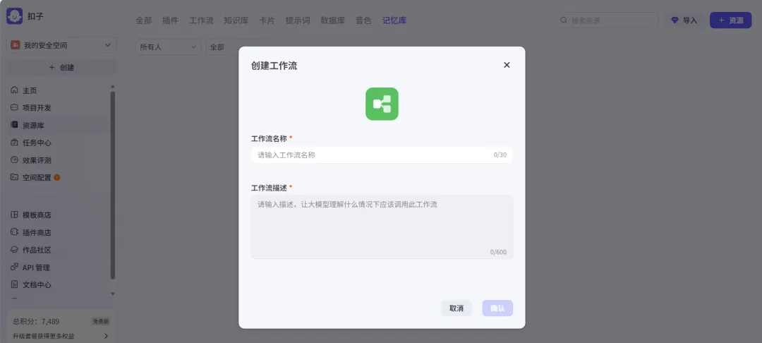 在COZE平台中点击添加资源,创建工作流,用英文或者拼音命名。