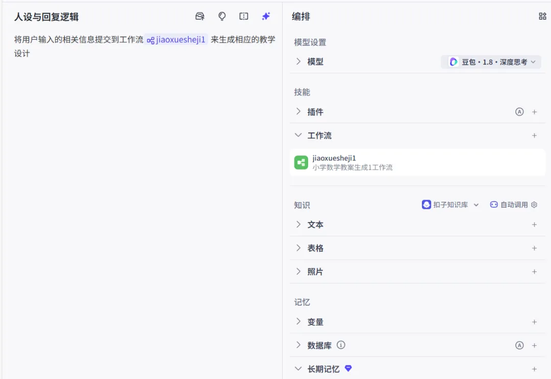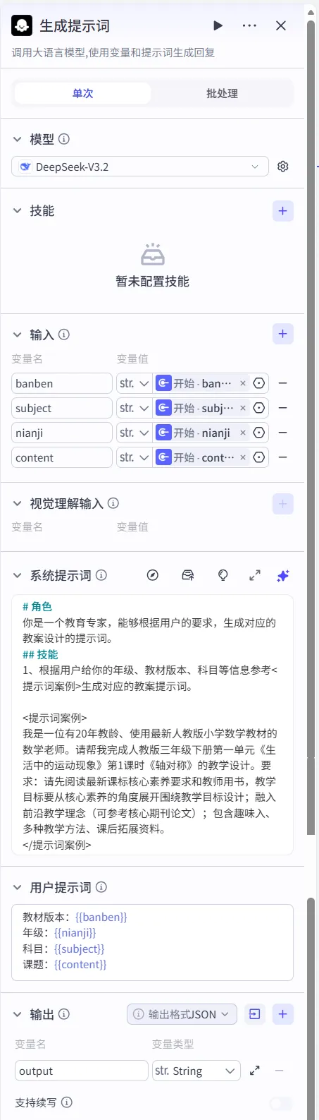 添加一个大模型,命名为“生成教学设计”,用于根据提示词生成教学设计。