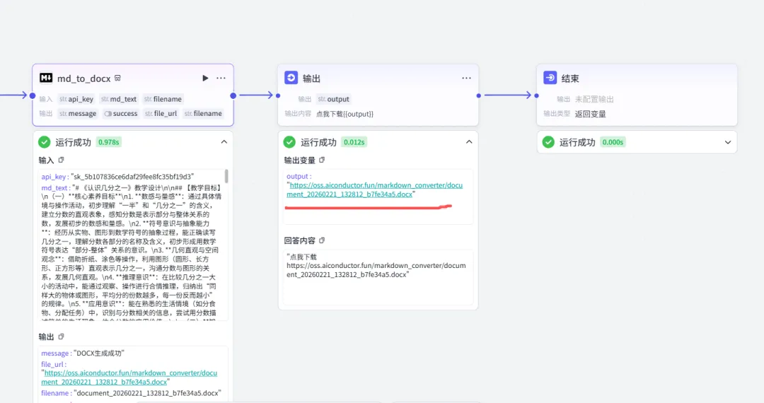 添加输出模块,输出变量为markdown转换器的file_url。