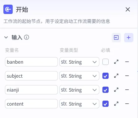 在开始节点添加主题(content)、年级(nianji)、学科(subject)、版本(banben)四个变量,变量名称为英文或者拼音。