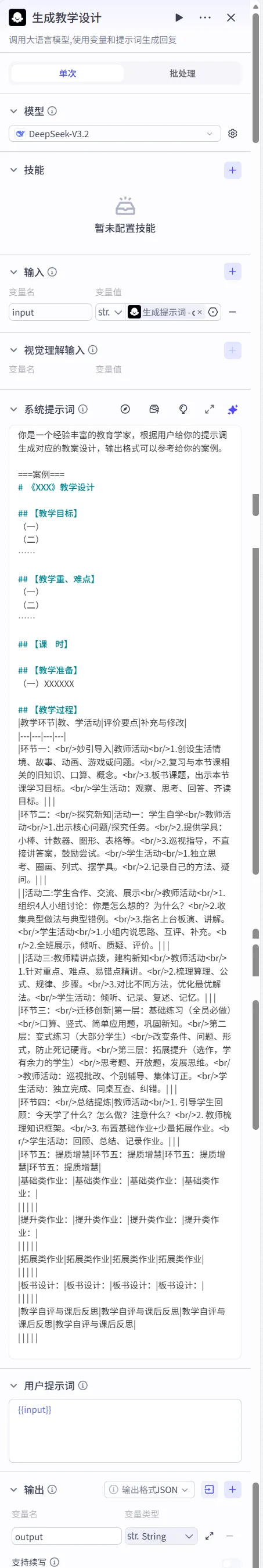 添加一个大模型,命名为“生成教学设计”,用于根据提示词生成教学设计。