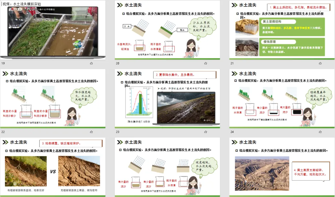 针对 “水土流失的自然与人为原因相互作用” 这一核心难点,设计用 “模拟实验 + 具象素材” 双管齐下。播放水土流失模拟实验视频,直观展示土壤类型、降水强度、植被覆盖、坡度对水土流失的影响,学生一眼就能看懂关键影响因素;搭配黄土地貌演变示意图、黄河下游地上河实景图,把 “塬→梁→峁” 的侵蚀过程、水土流失的连锁危害具象化。原本晦涩的地理原理,变成了可观察、可感知的画面,学生理解起来毫不费力。