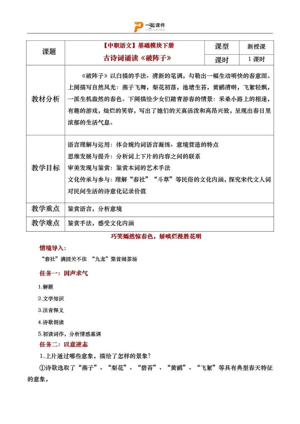 >【中职语文基础模块下】| 《破阵子》:课件+教学设计