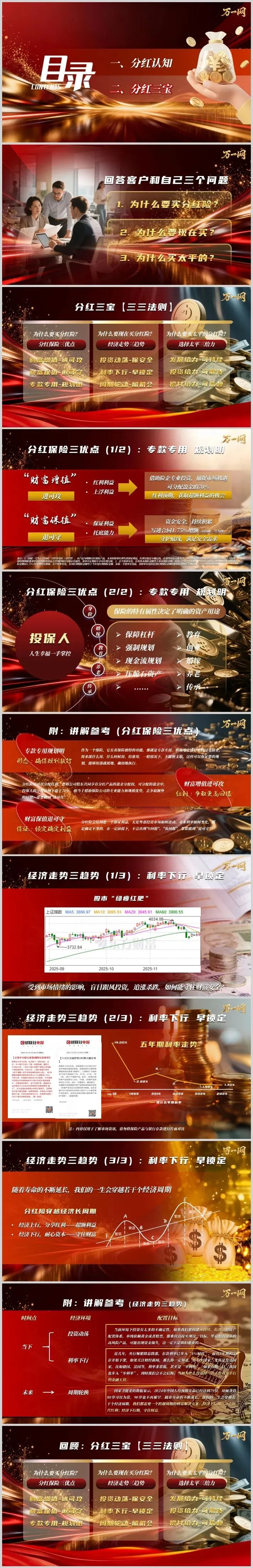 正如资料小结所言:我们销售的是一份优质资产,拥有优质资产永不嫌多;分红险是既能保证安全,又能捕捉市场机遇的优质资产;选择分红险最重要的就是选择好公司。在利率下行、周期轮动的2026年,把握分红险的三宝三三法则,即是把握财富管理的确定性未来。