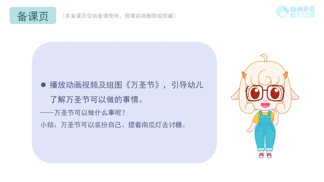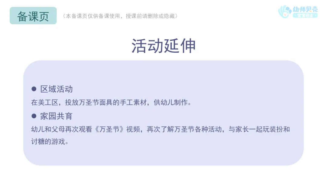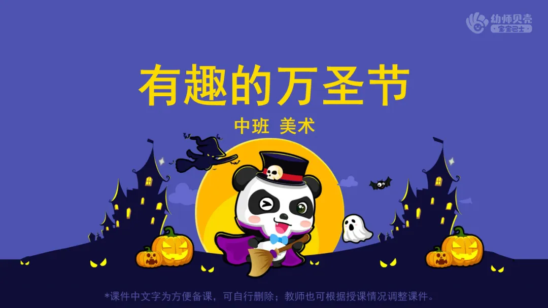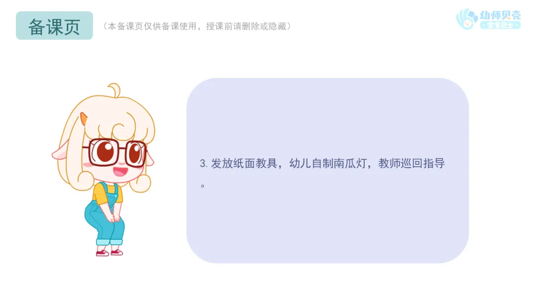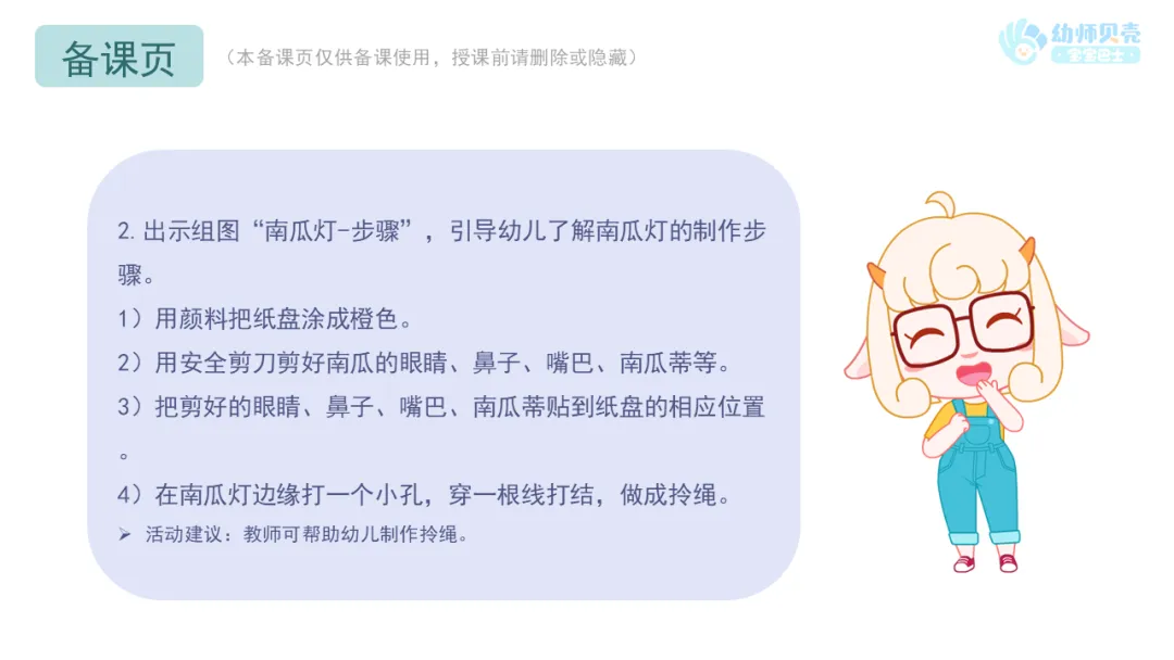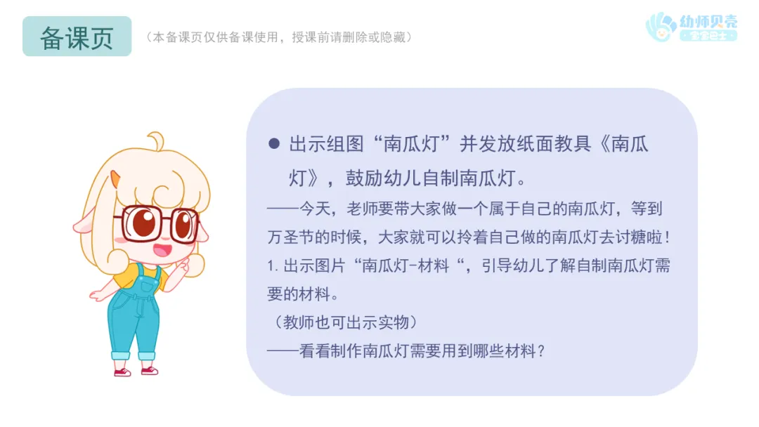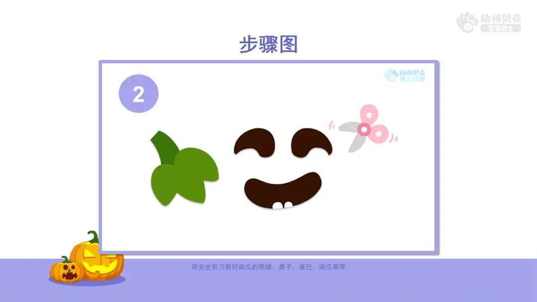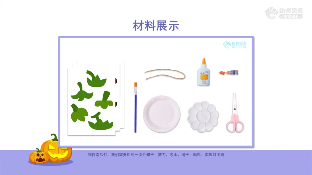 ——今天,老师要带大家做一个属于自己的南瓜灯,等到万圣节的时候,大家就可以拎着自己做的南瓜灯去讨糖啦!